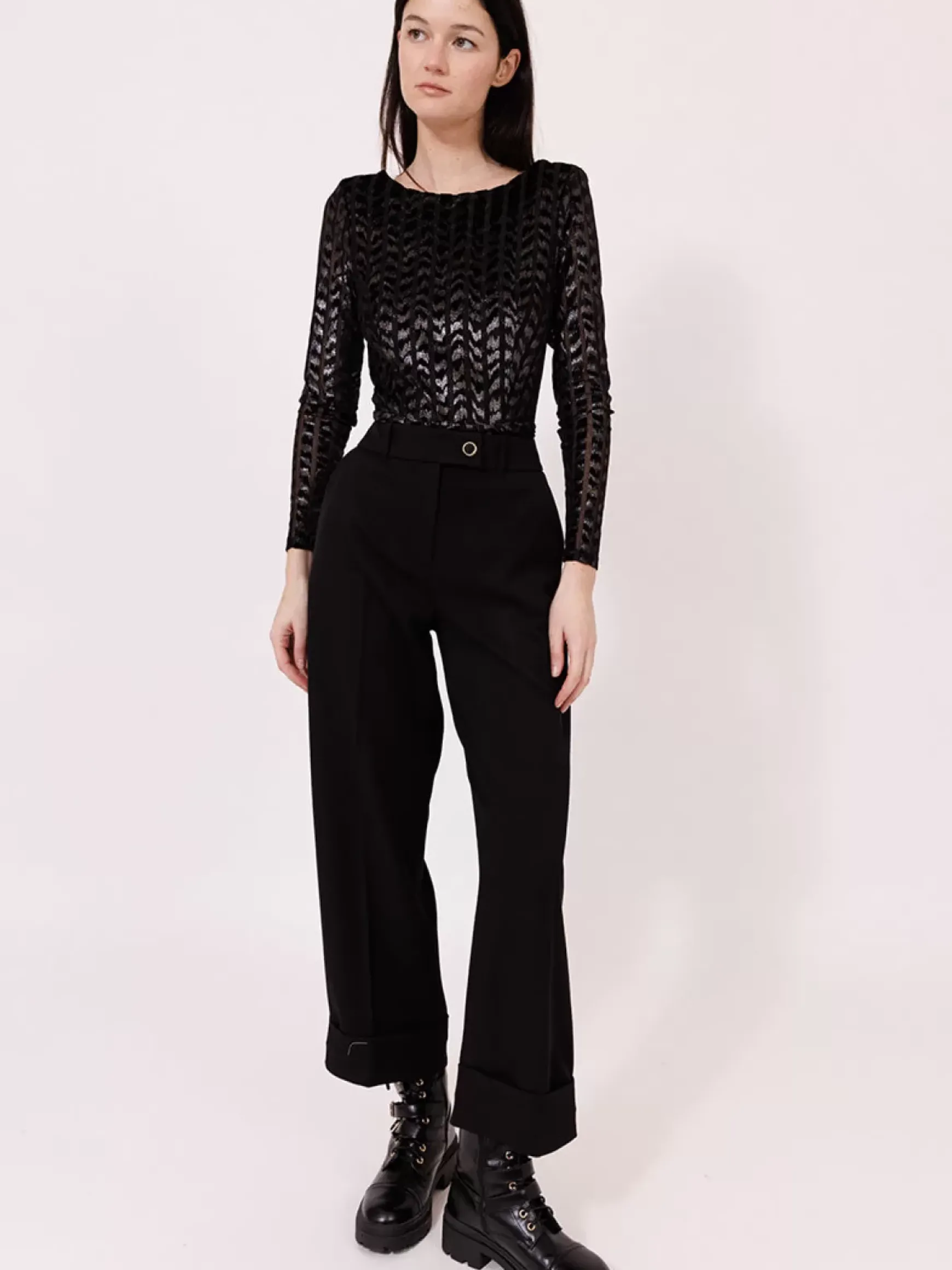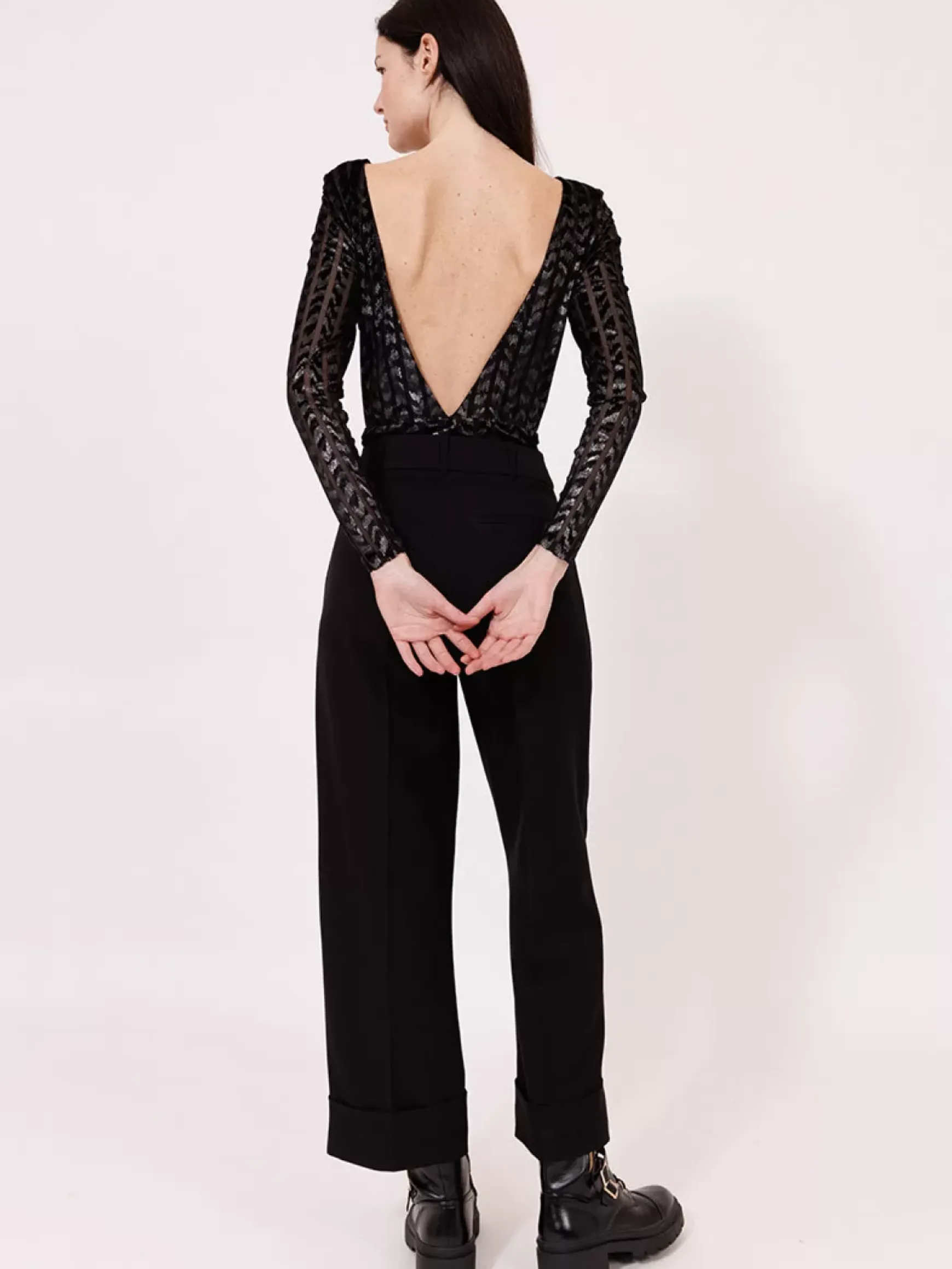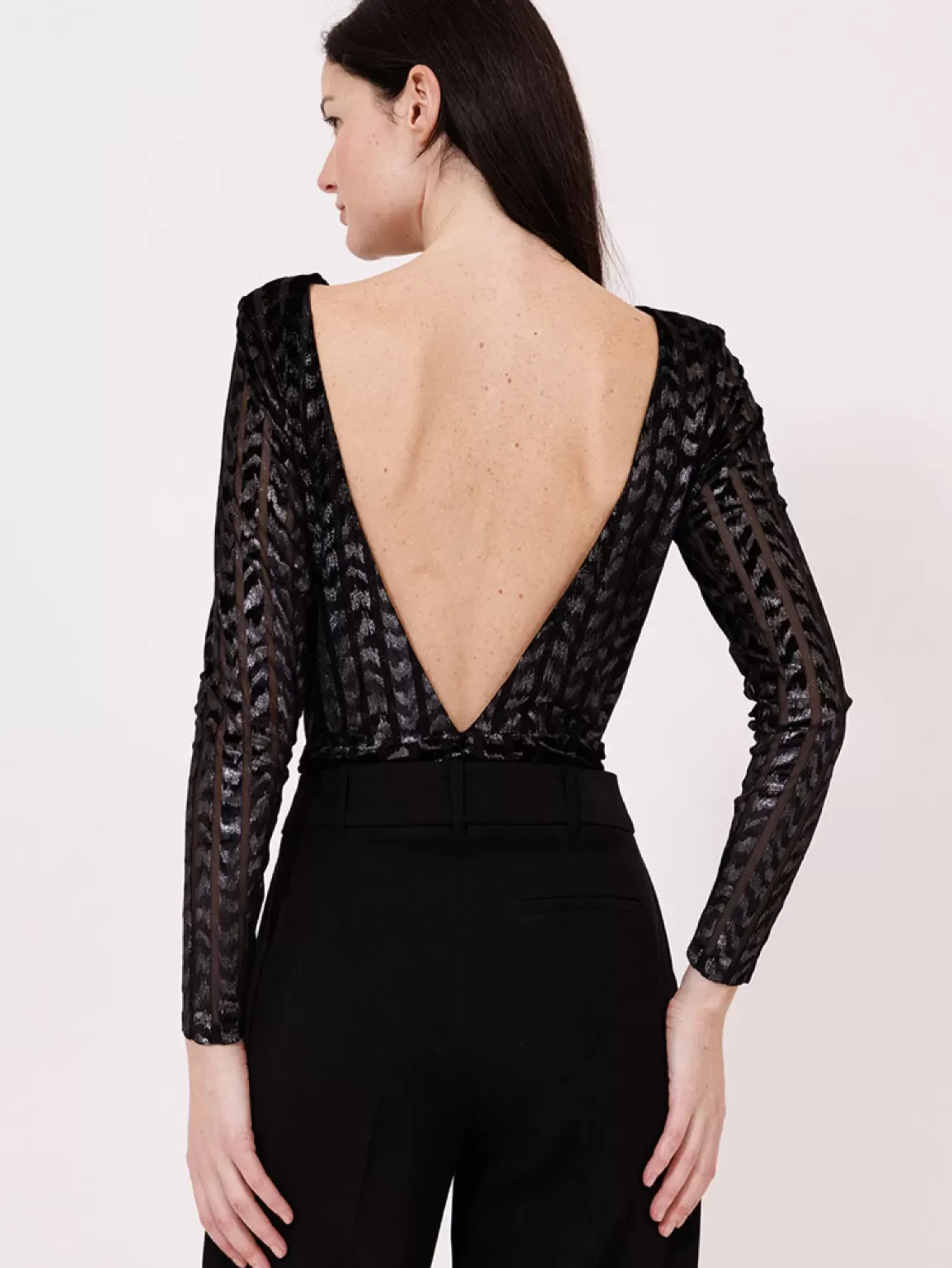 Ce body à manches longues, confectionné en velours dévoré et foil, est une pièce audacieuse et séduisante. Il combine parfaitement luxe et confort.