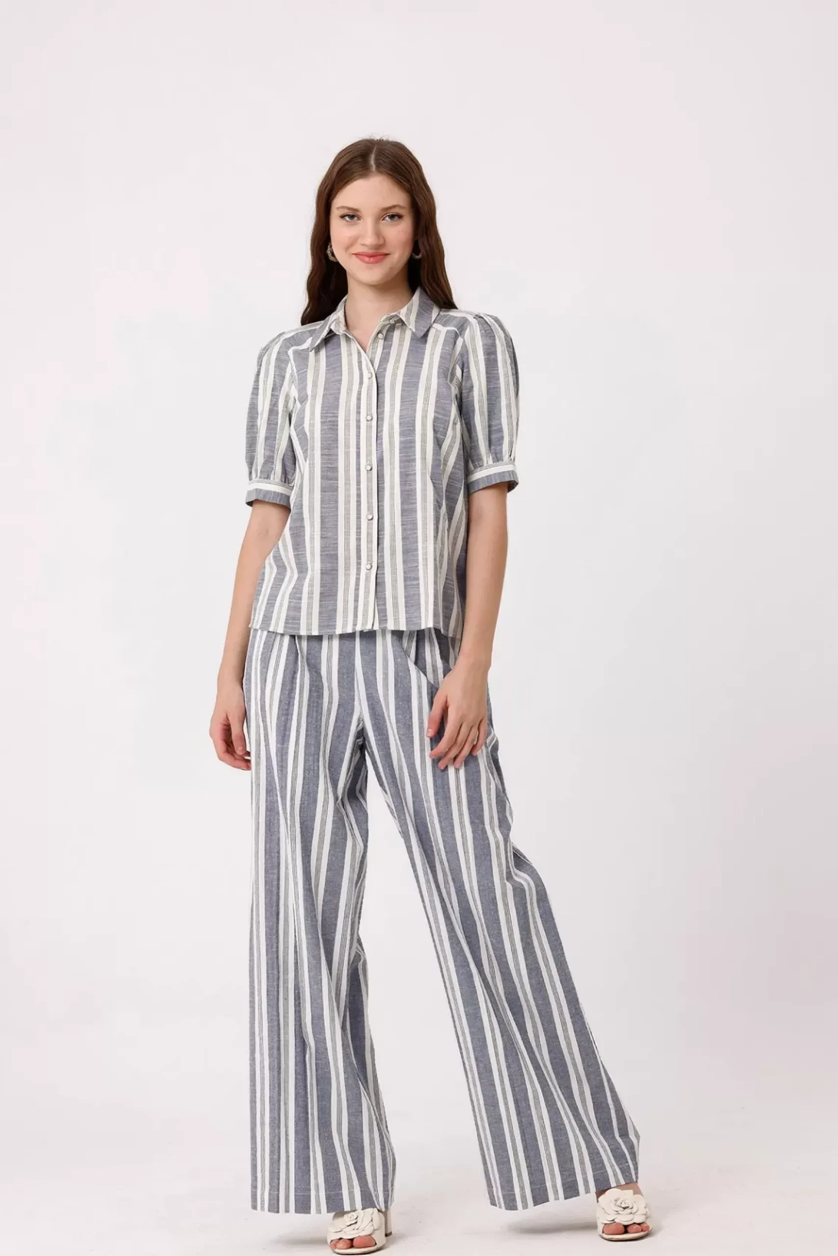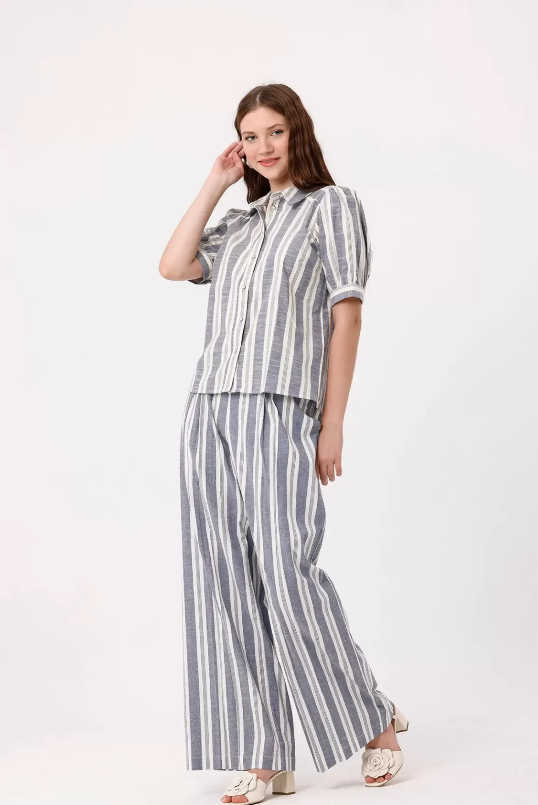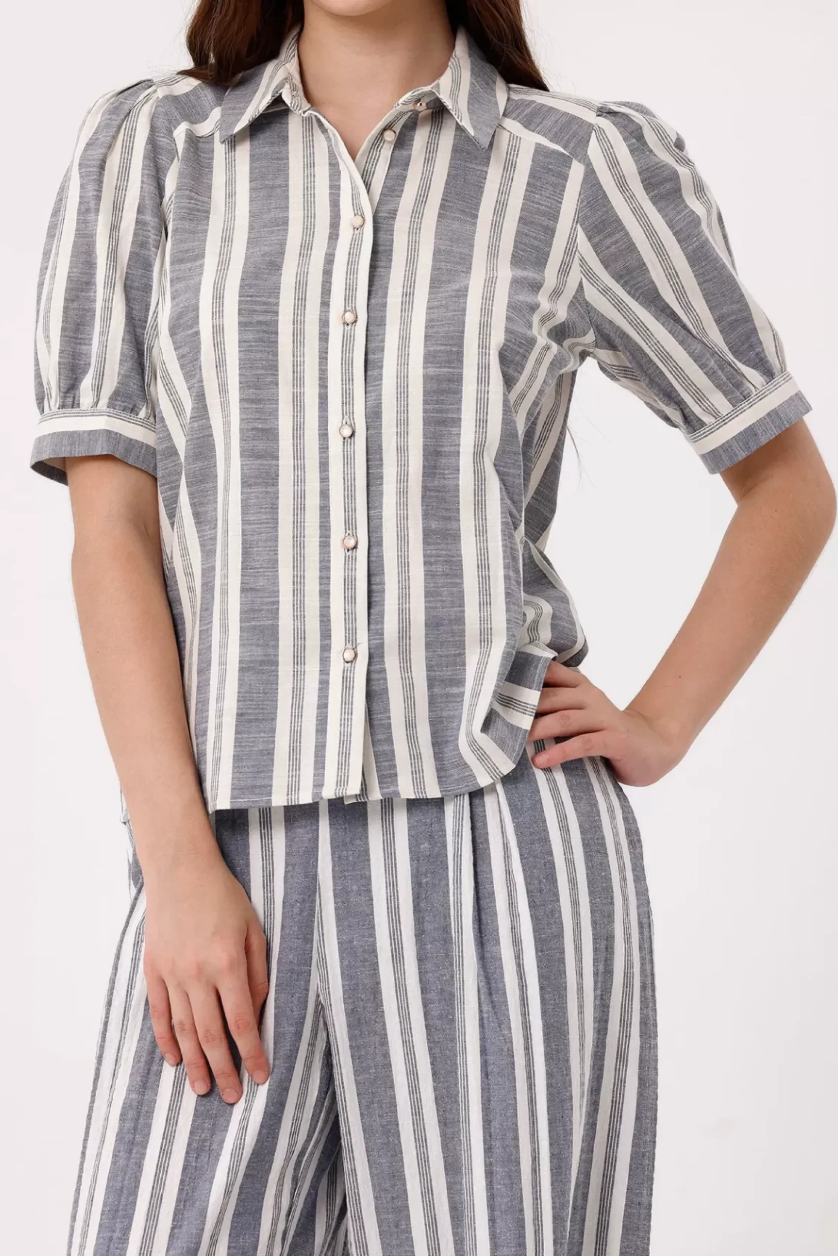 Découvrez cette chemise rayée en tissu composé de lin : manches courtes boutonnables et boutons nacrés avec cercles dorés devant pour une touche sophistiquée.
