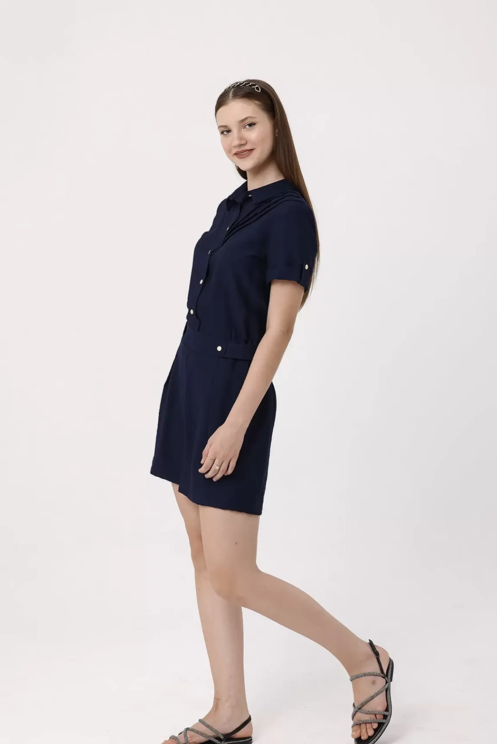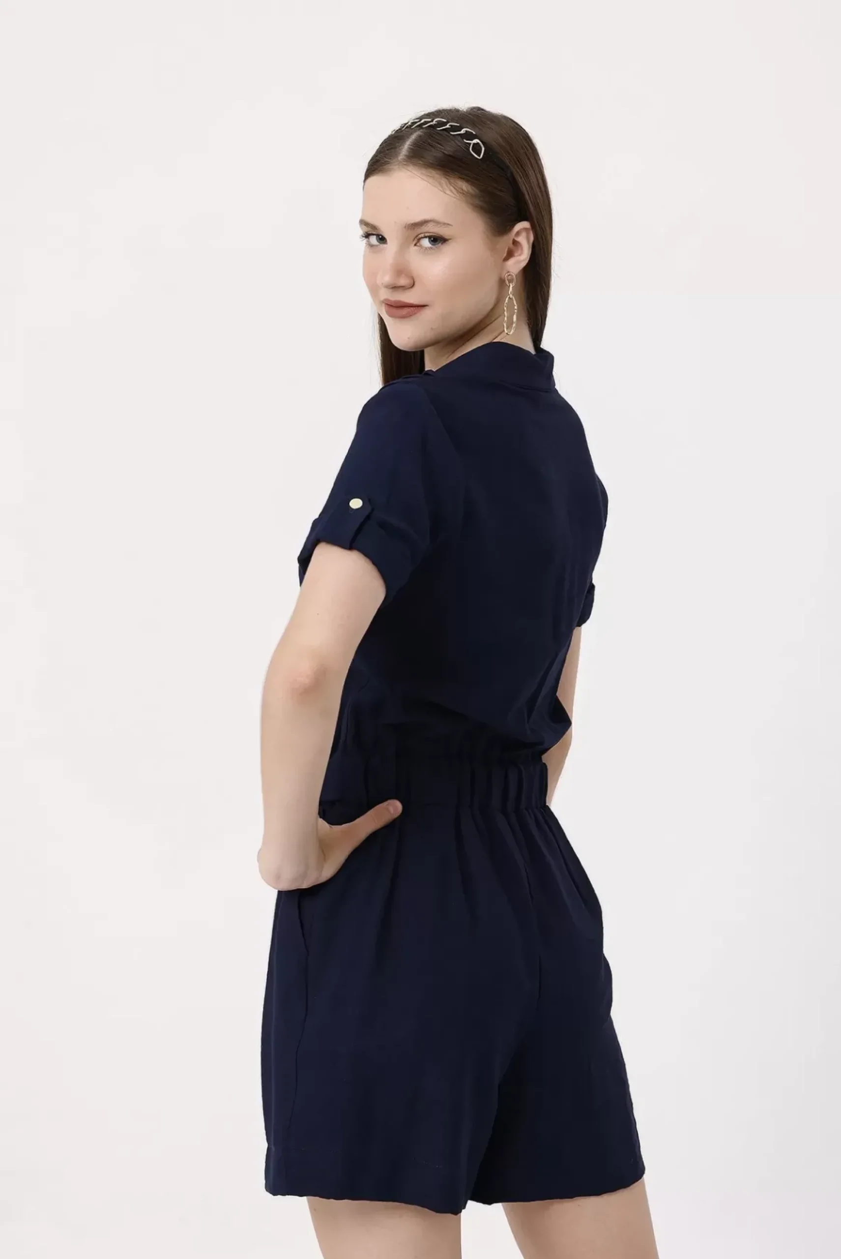 Découvrez notre combinaison élégante avec col chemise, ornée de détails de plis sur le buste et de pattes à la ceinture des manches. Dotée d’une taille élastique au dos pour un ajustement confortable.