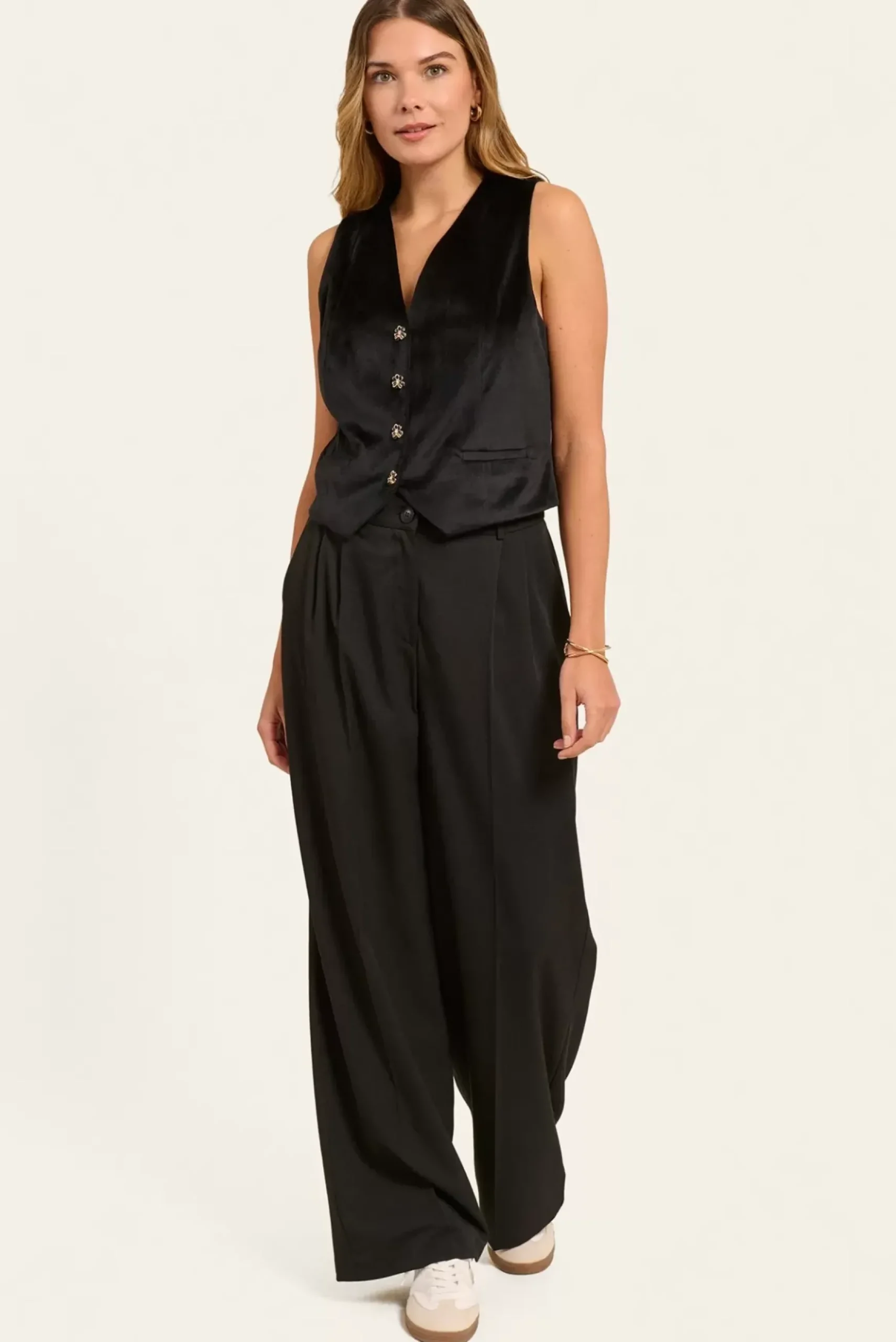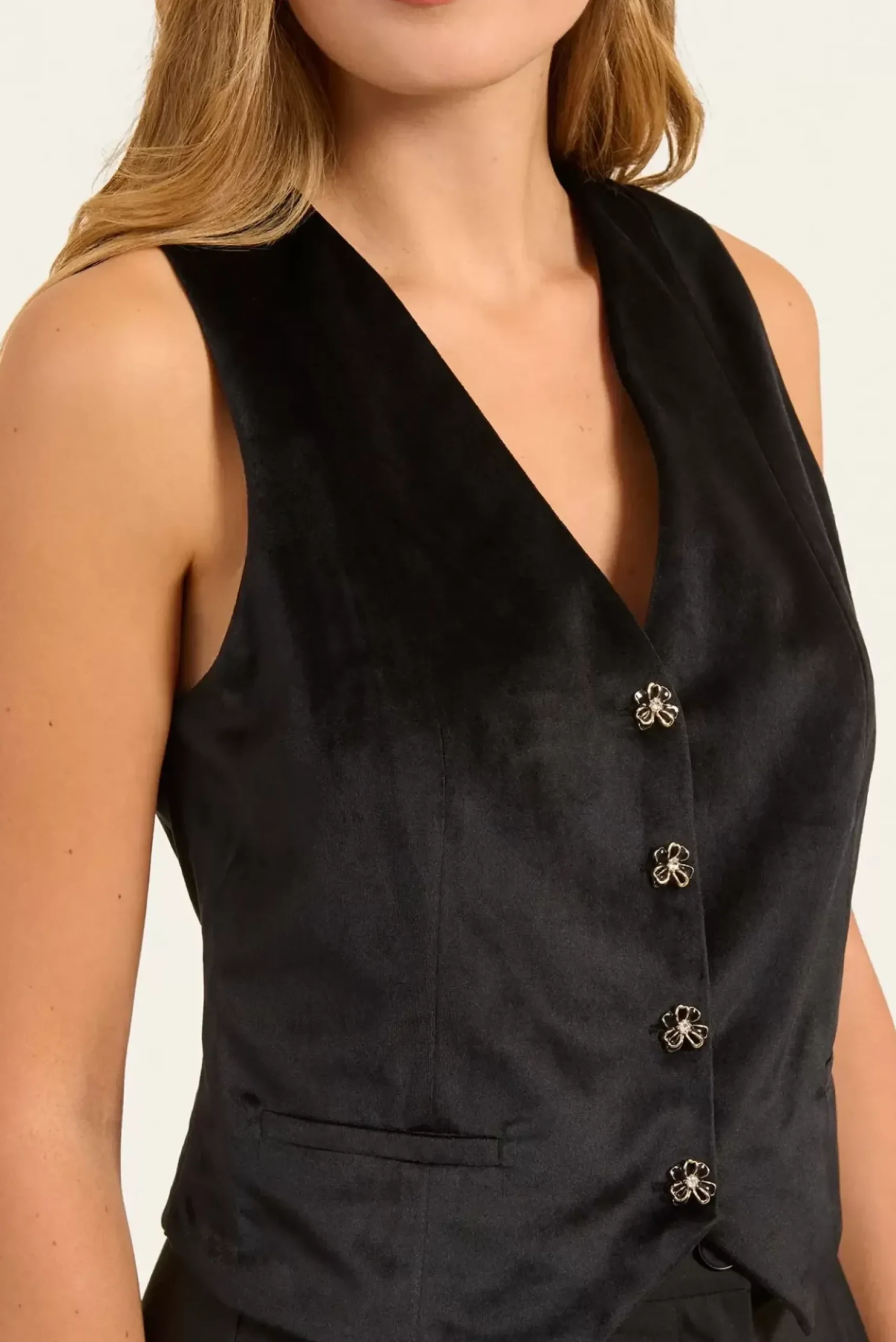 Ce gilet sans manches en velours avec ses boutons bijou ajoute une touche de luxe à vos tenues, tandis que les découpes princesse assurent une silhouette élégante.