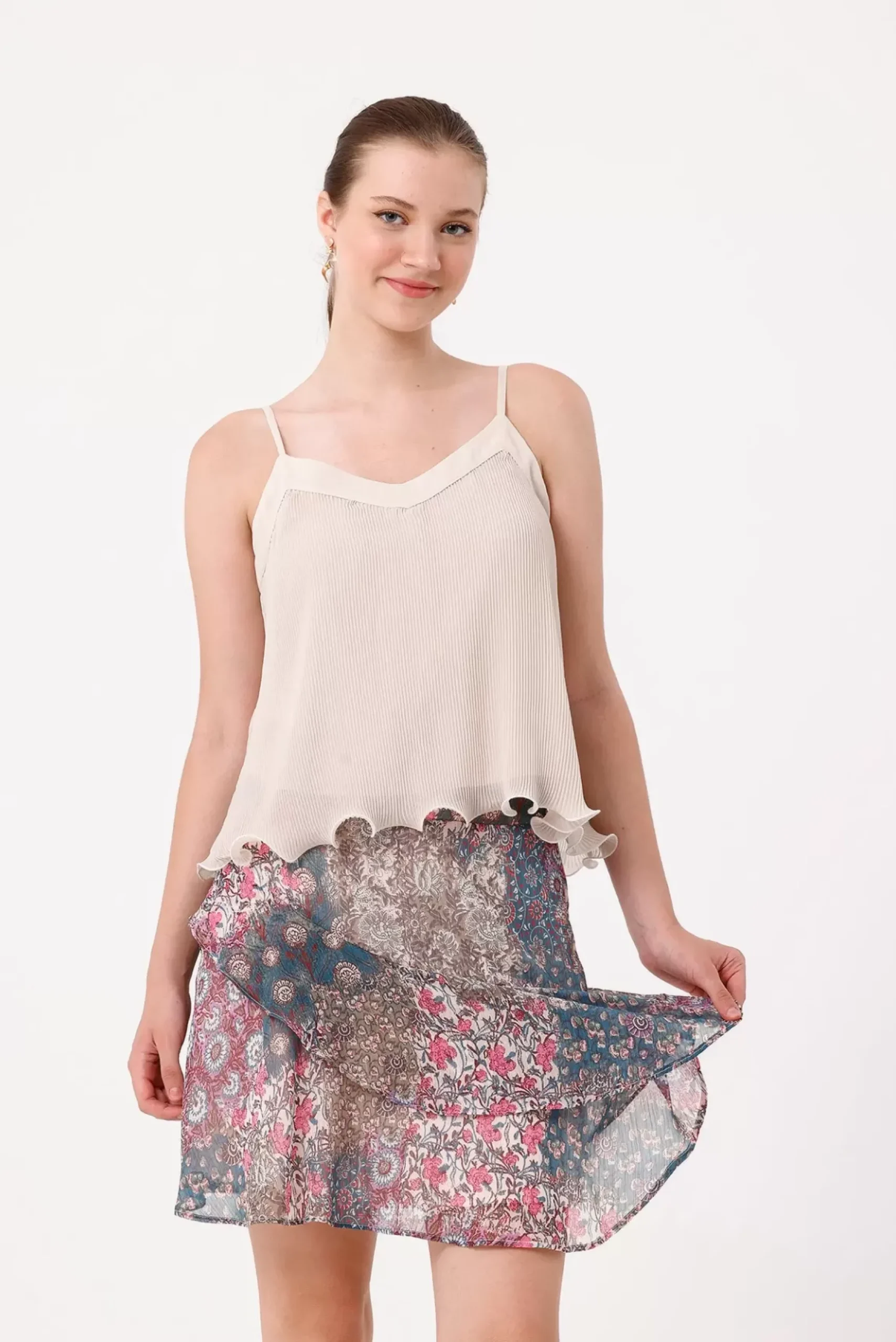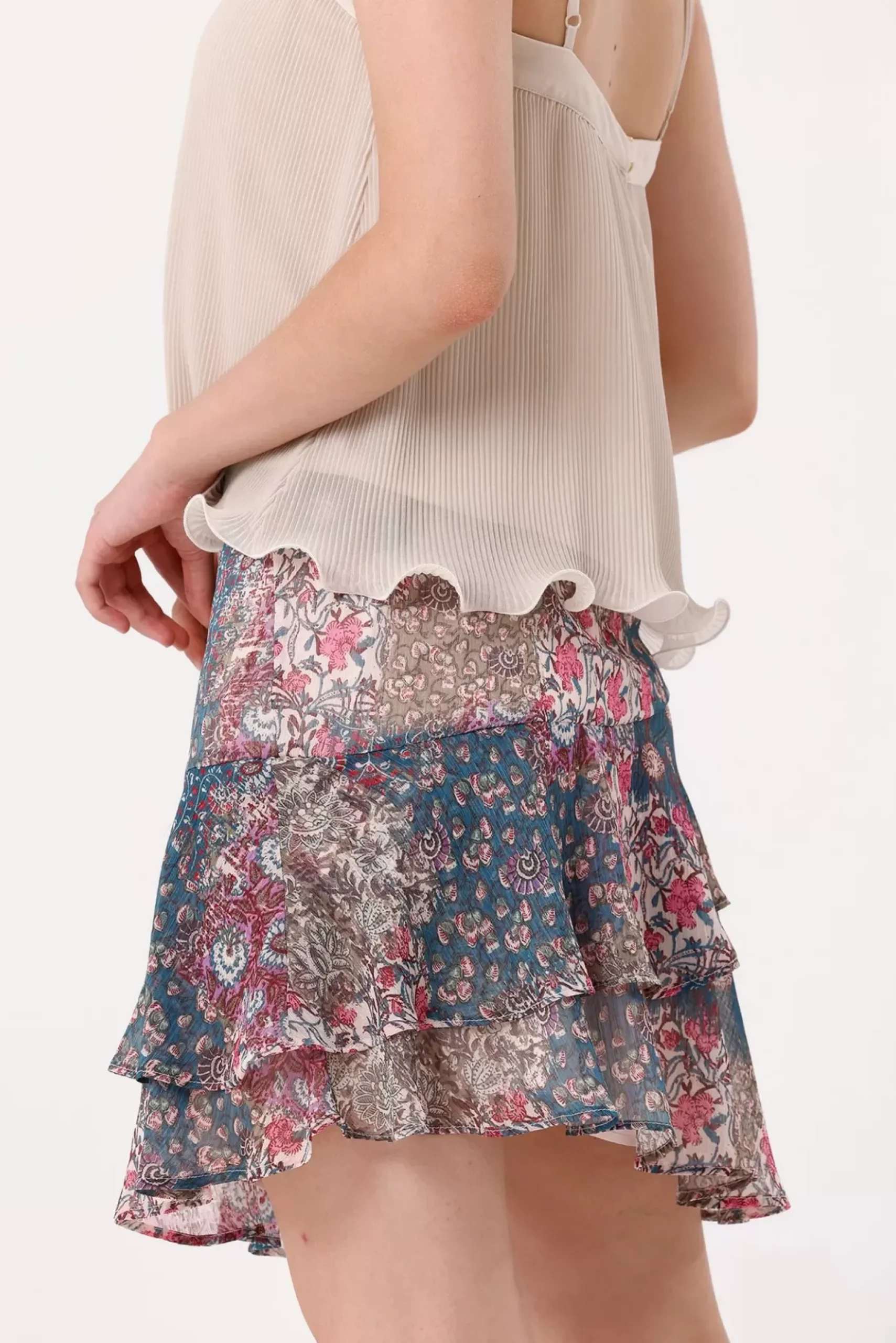 Découvrez cette jupe courte au tissu imprimé effet patchwork, doublée pour un confort optimal. Elle présente un volant en biais à l’avant et à l’arrière, avec une taille élastique pour un ajustement facile.