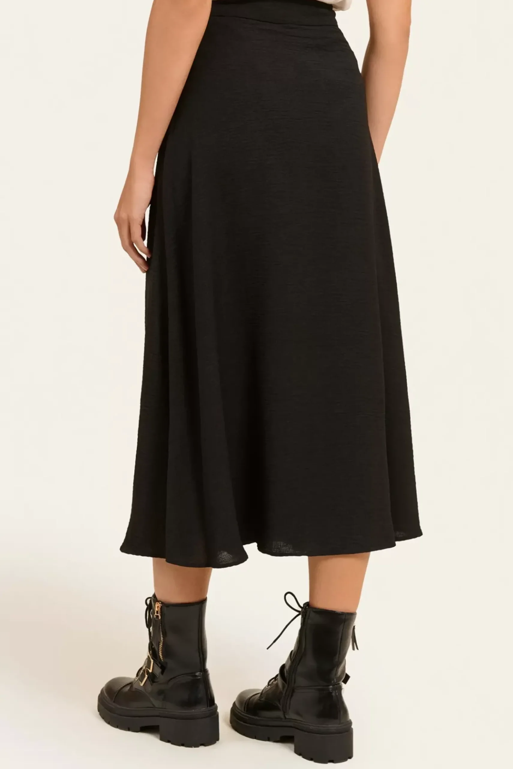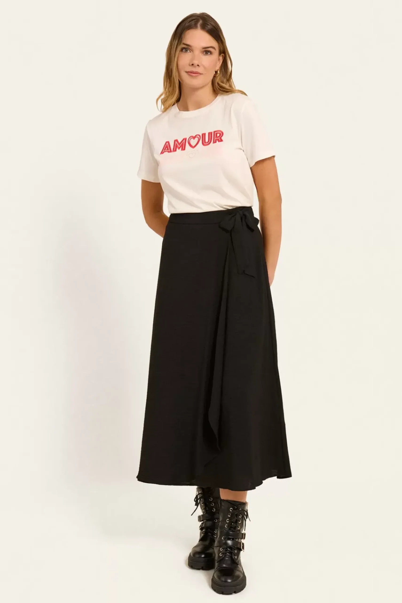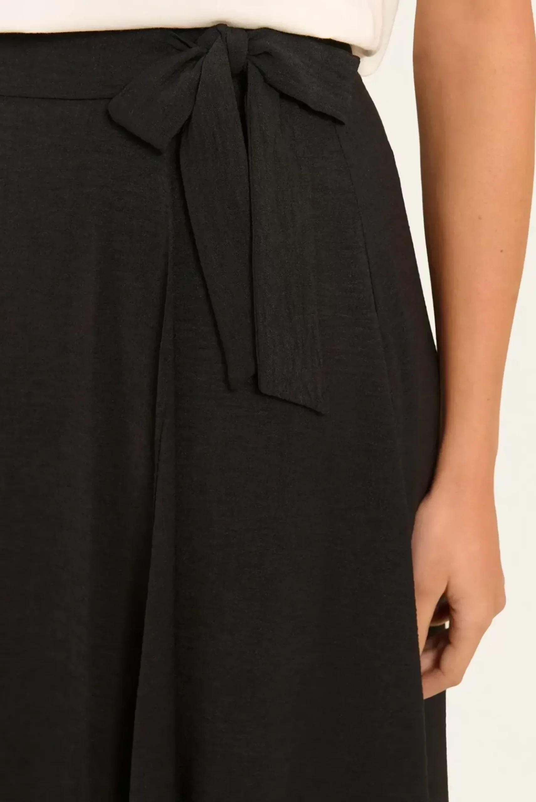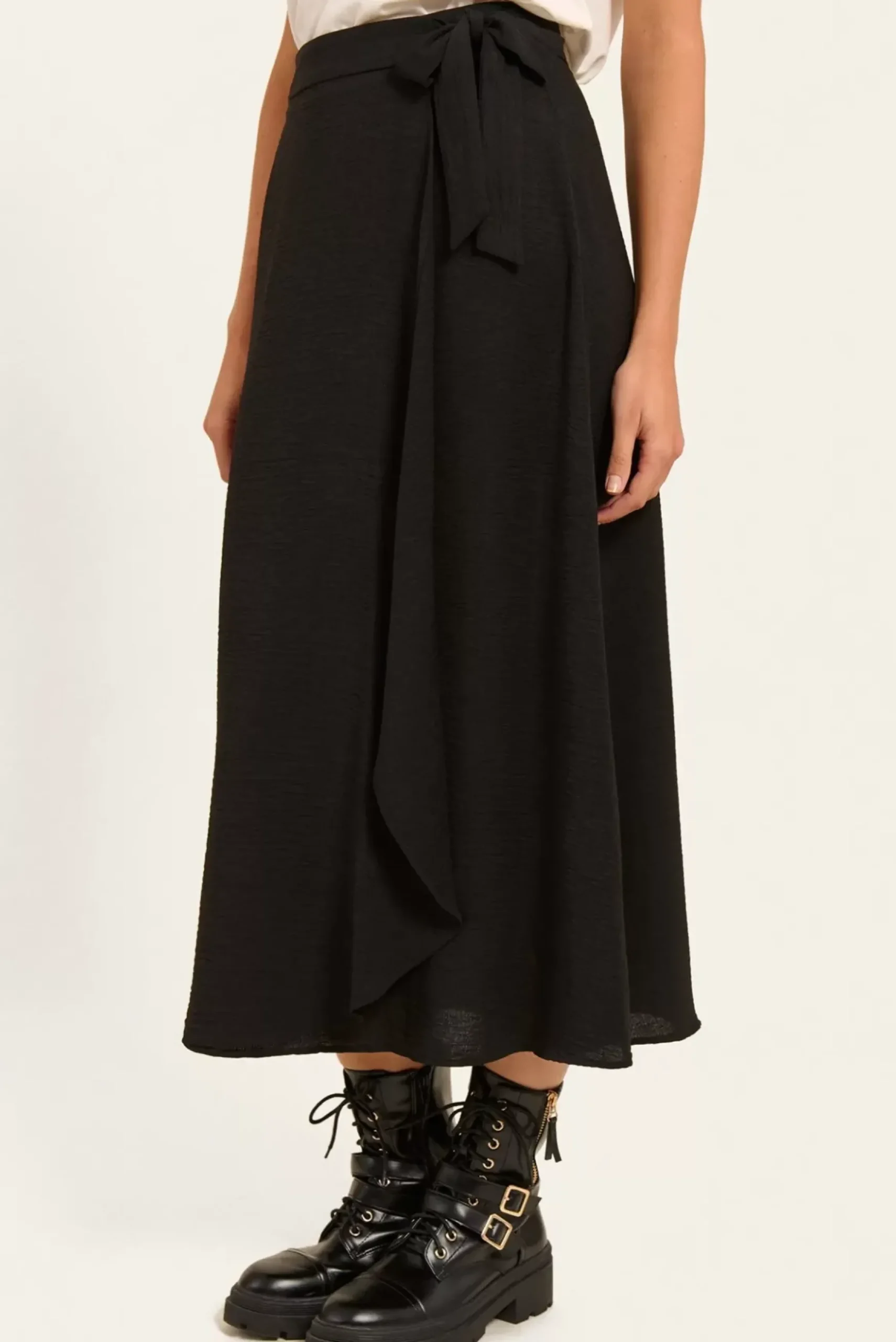 Cette jupe midi effet portefeuille avec une taille haute et un lien à nouer sur le côté gauche est parfaite pour un look féminin et élégant. Son design asymétrique ajoute du mouvement et de la légèreté à votre silhouette.