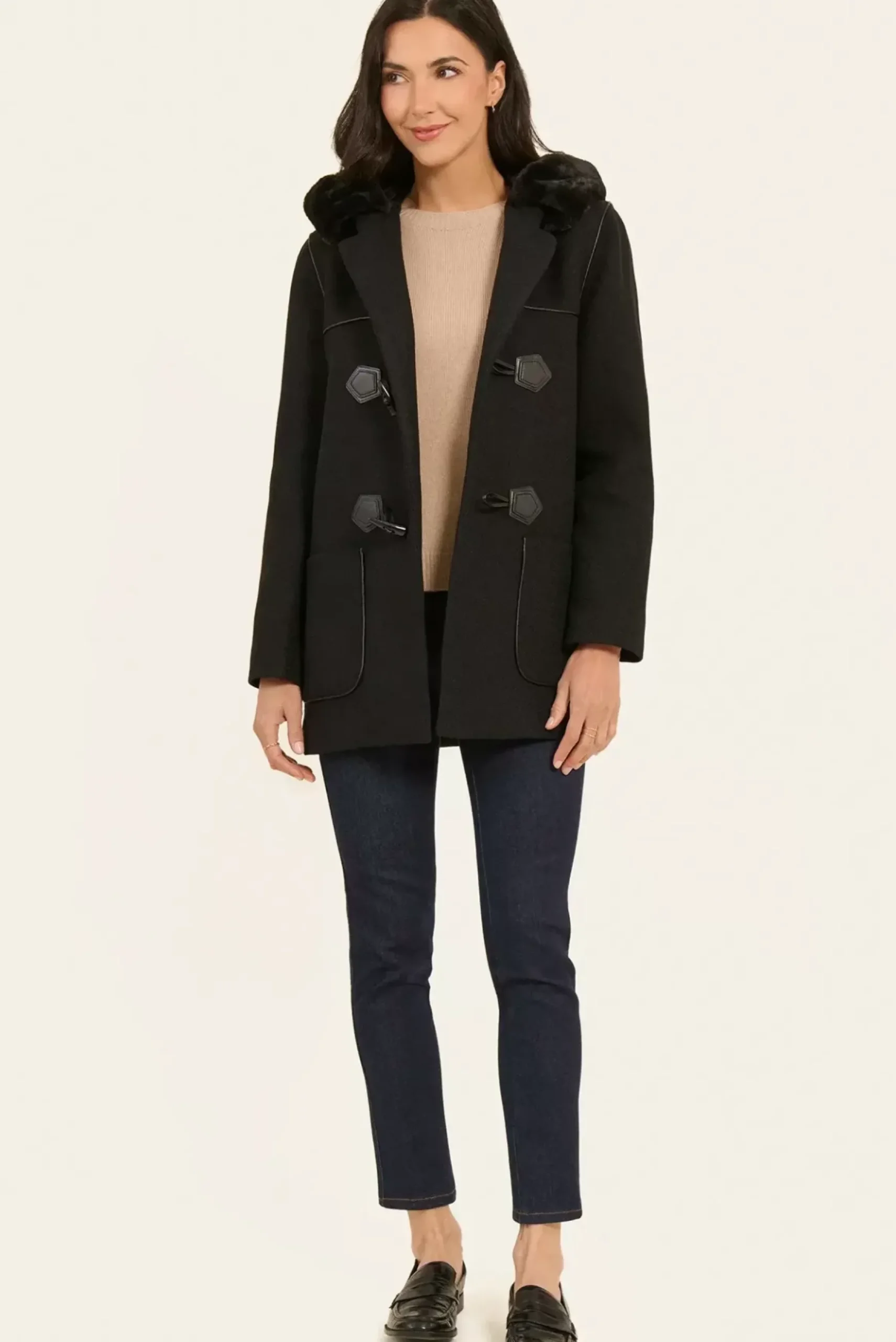Le duffle-coat avec capuche et empiècements sur le devant est l’allié parfait pour un hiver chaleureux et stylé. Ce manteau, doublé pour un confort optimal, offre une protection contre le froid tout en ajoutant une touche d’élégance à vos tenues. Les manches longues et la capuche ajoutent à sa fonctionnalité, tandis que la fermeture avec 3 attaches effet corne apporte une note vintage et sophistiquée.