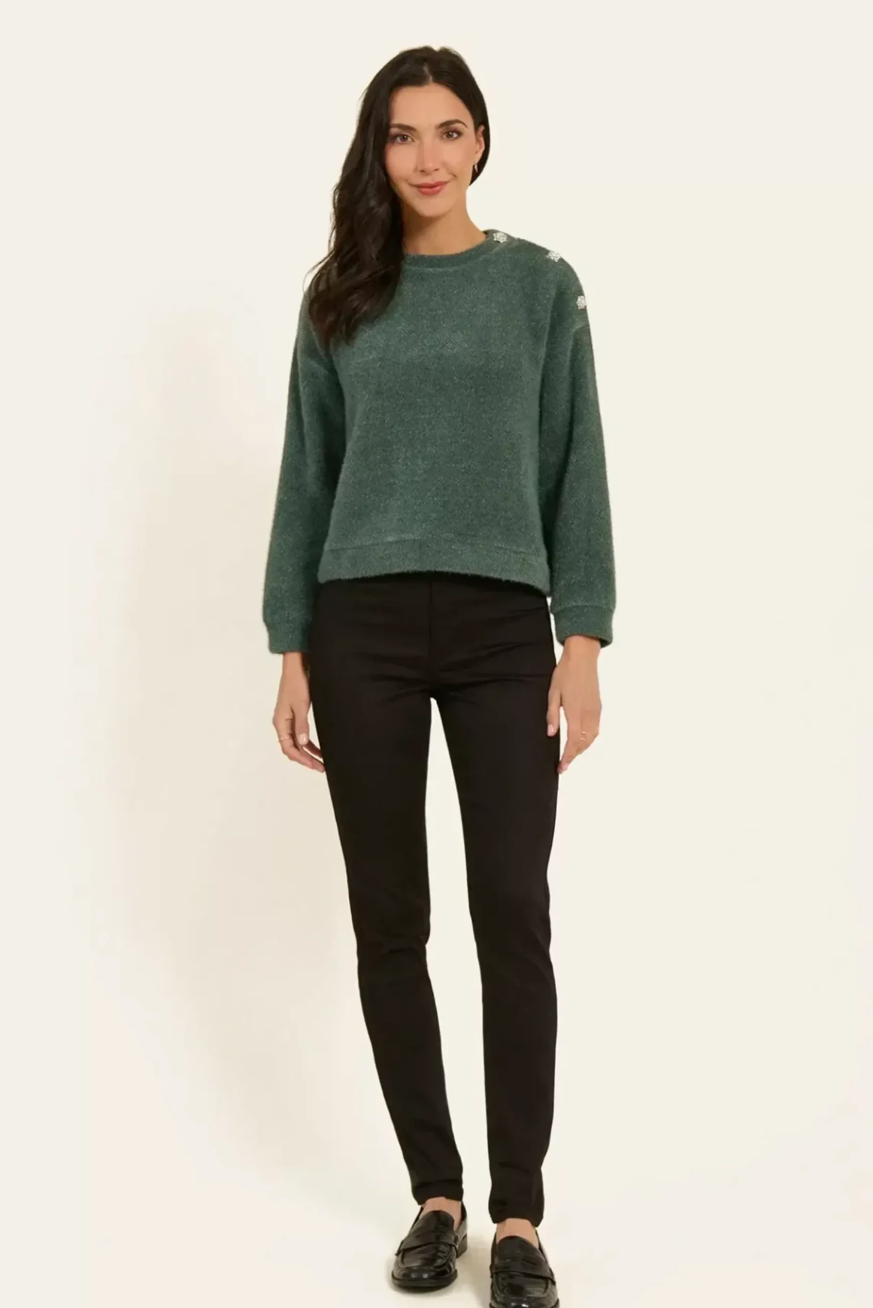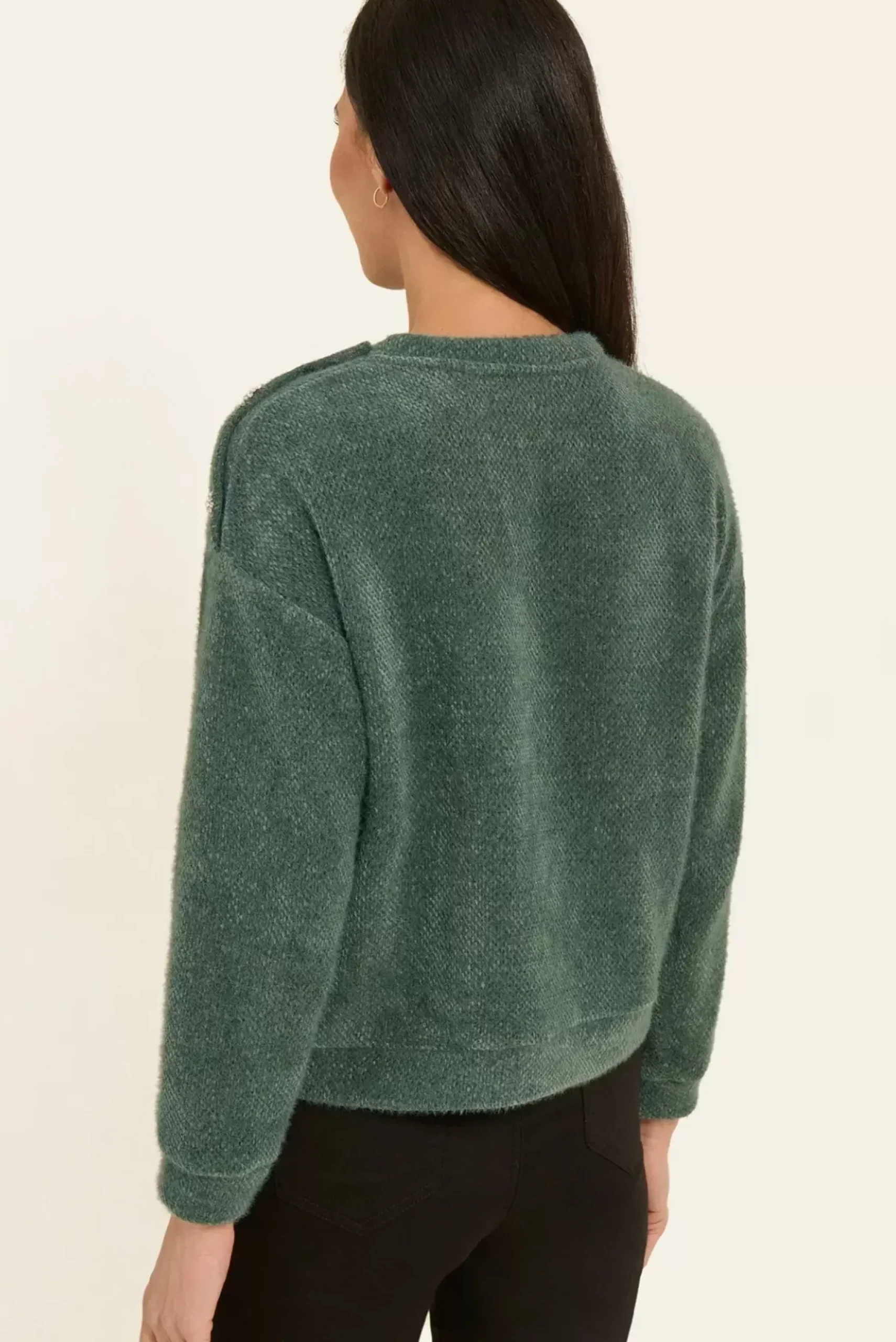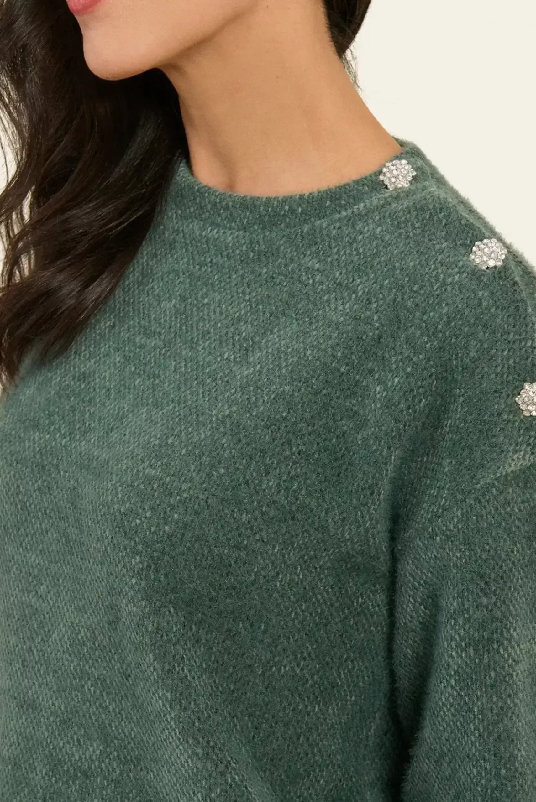 Ce pull à col rond est un incontournable de la saison. Avec ses manches longues élégantes, il se distingue par ses deux boutons bijou raffinés sur l’épaule gauche, ajoutant une touche de brillance à un style classique.