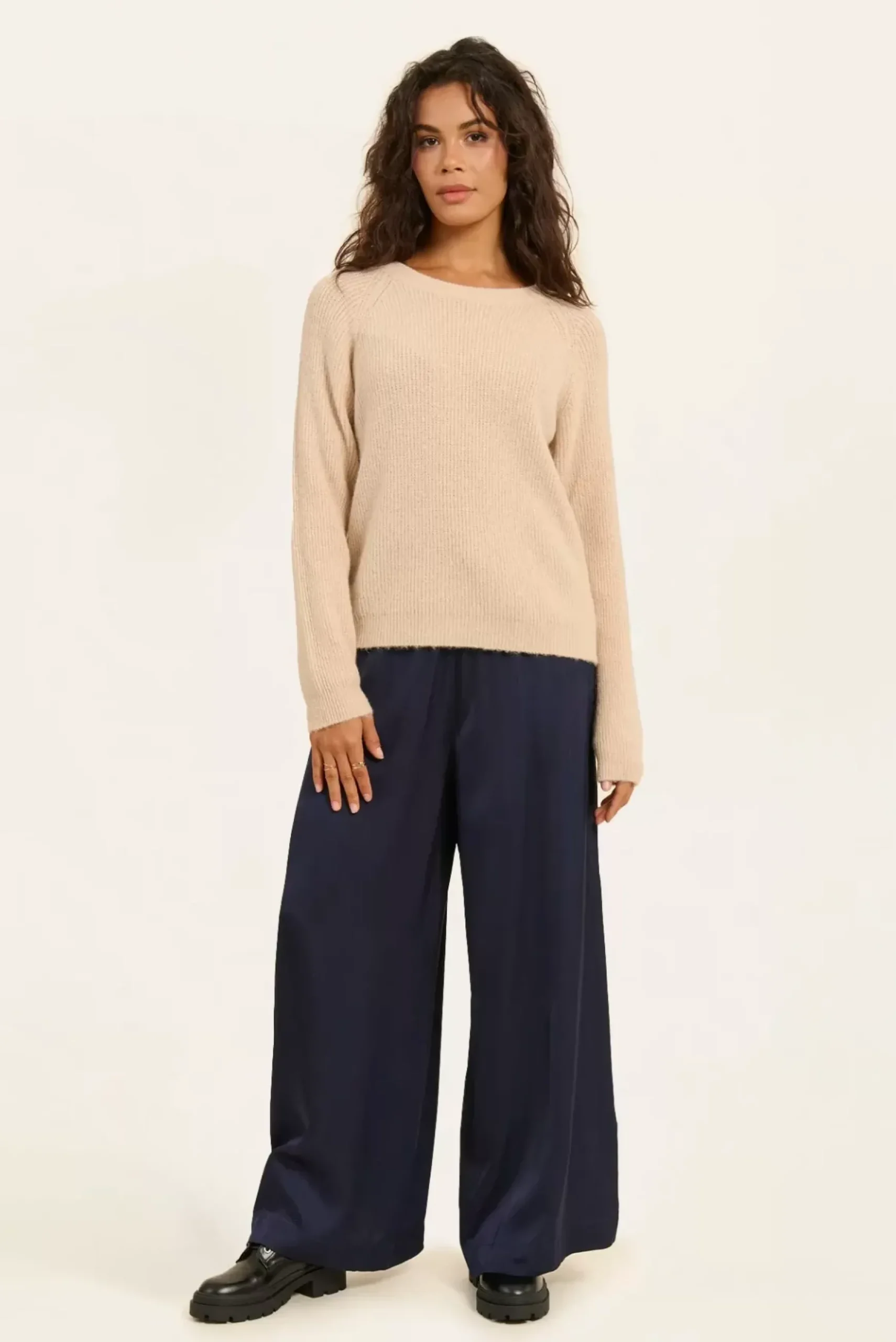 Ce pull à col rond allie confort et élégance. Ses manches longues raglan et ses bords-côtes au col, aux poignets et à la base ajoutent une touche structurée et moderne.