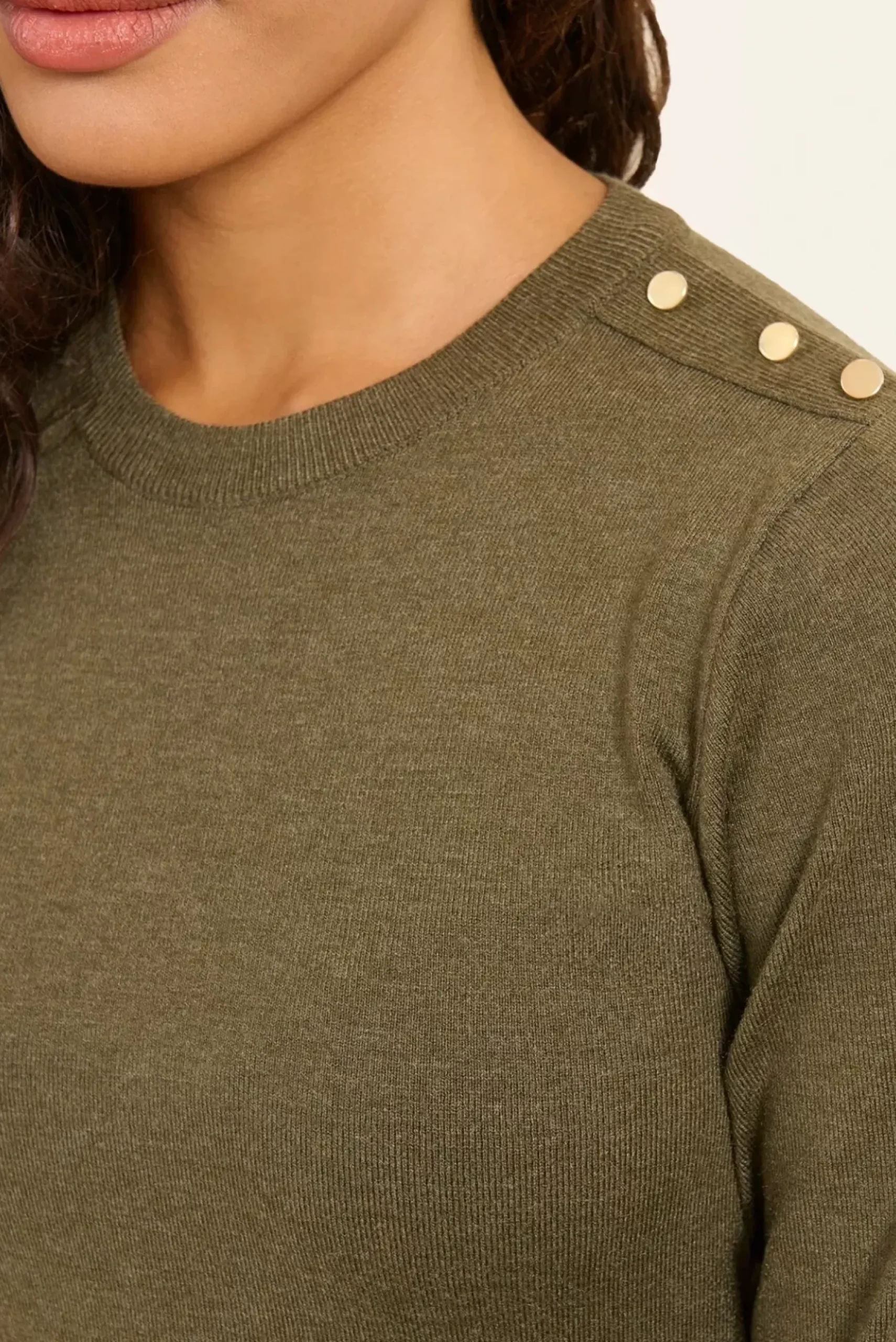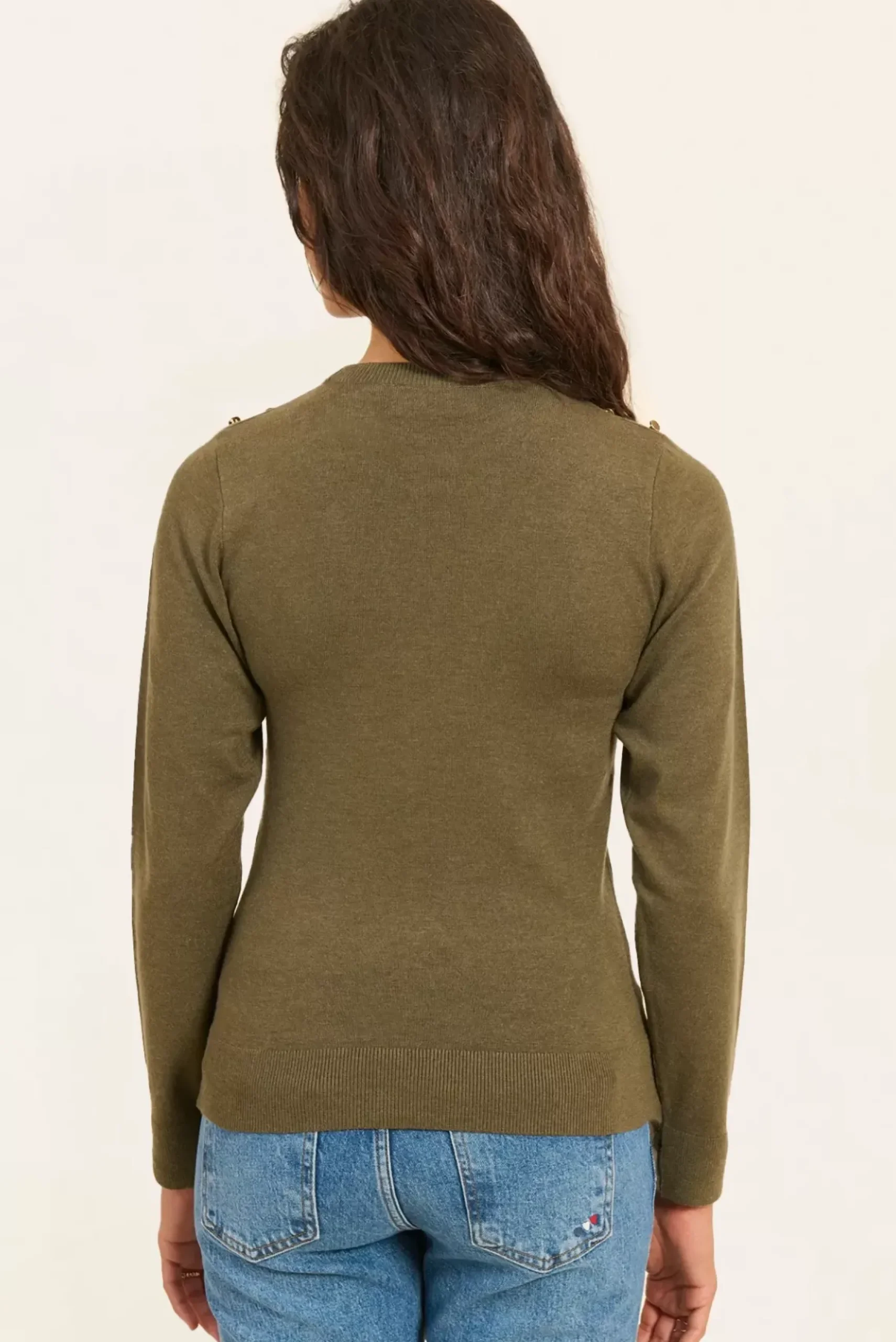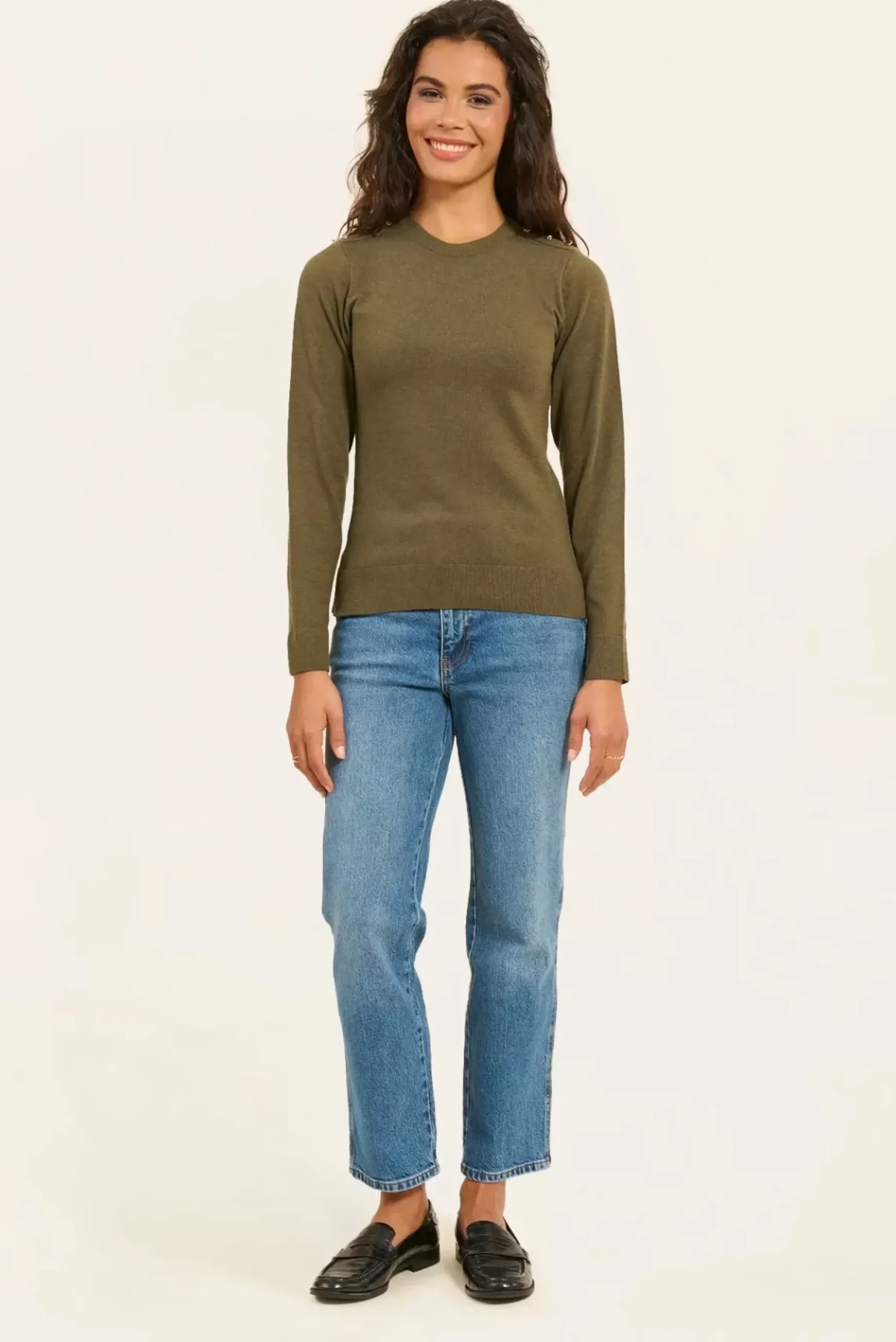 Ce pull à col rond, agrémenté de boutons sur les épaules, allie élégance et confort. Ses manches longues et ses bords-côtes bien ajustés au col, aux poignets, et à la base en font un essentiel de votre garde-robe.