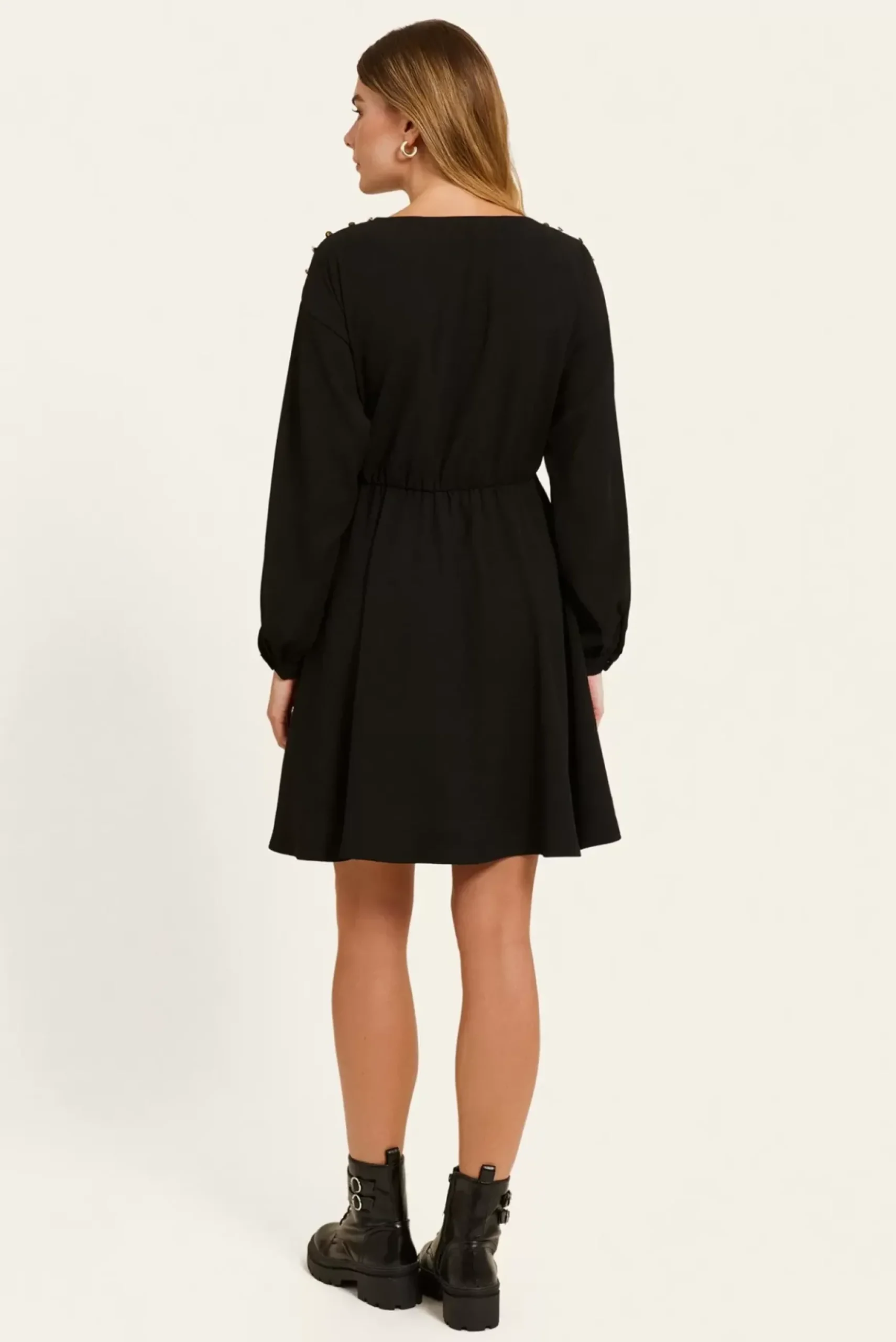 Cette robe courte à col bateau allie élégance et modernité, avec des manches longues et des détails raffinés. Les boutons sur l’épaule ajoutent une touche chic, tandis que la taille élastiquée assure un confort optimal.