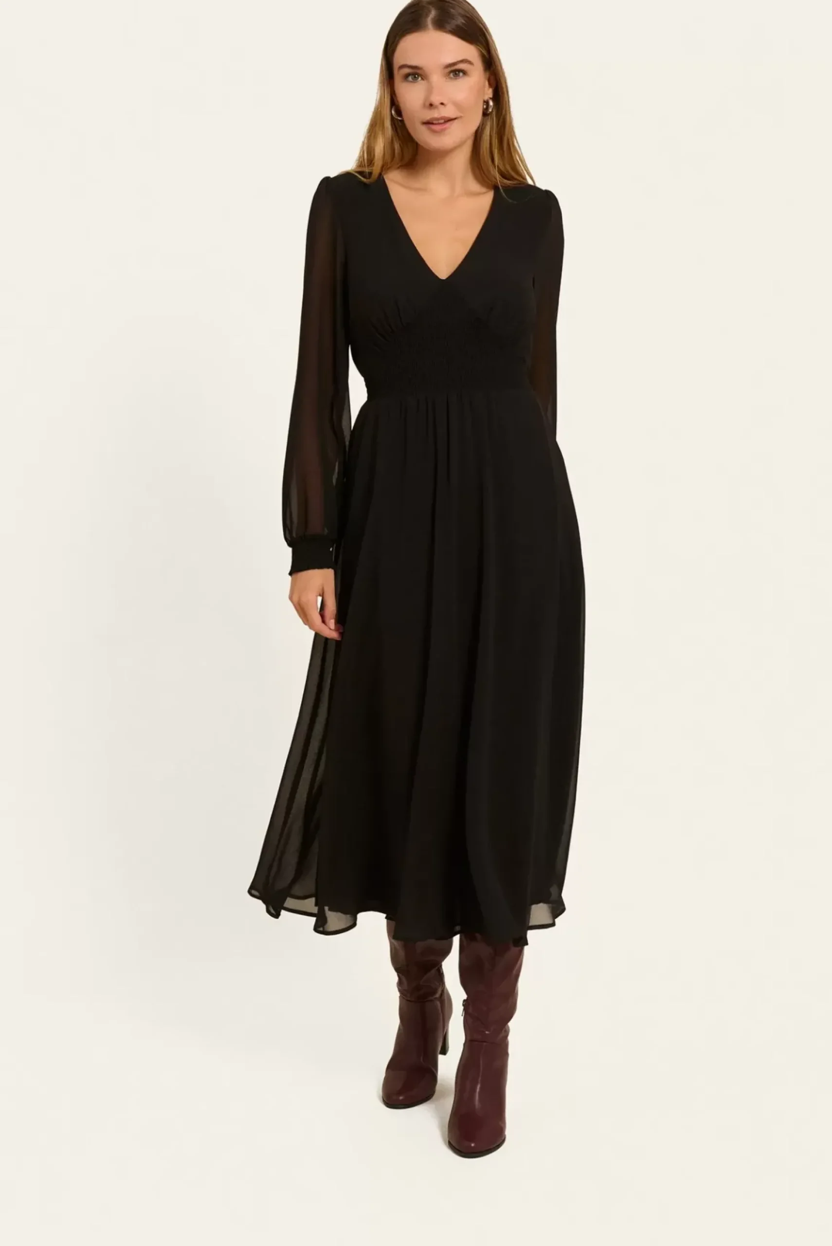 Cette robe midi fluide à col V, doublée, allie confort et élégance avec ses manches longues non doublées et sa taille élastiquée.