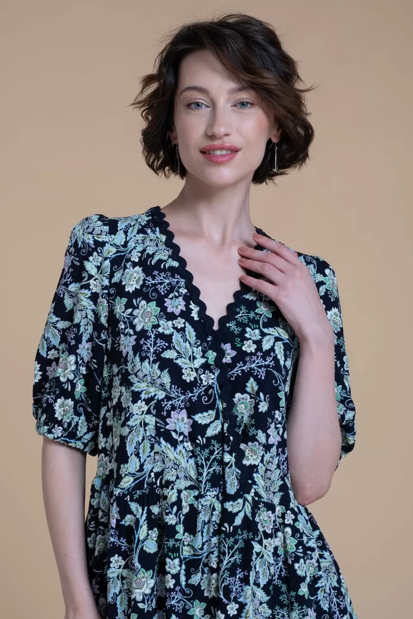 Découvrez cette robe imprimée fleurie avec un effet cache-cœur, entièrement doublée pour un confort optimal et un look élégant.