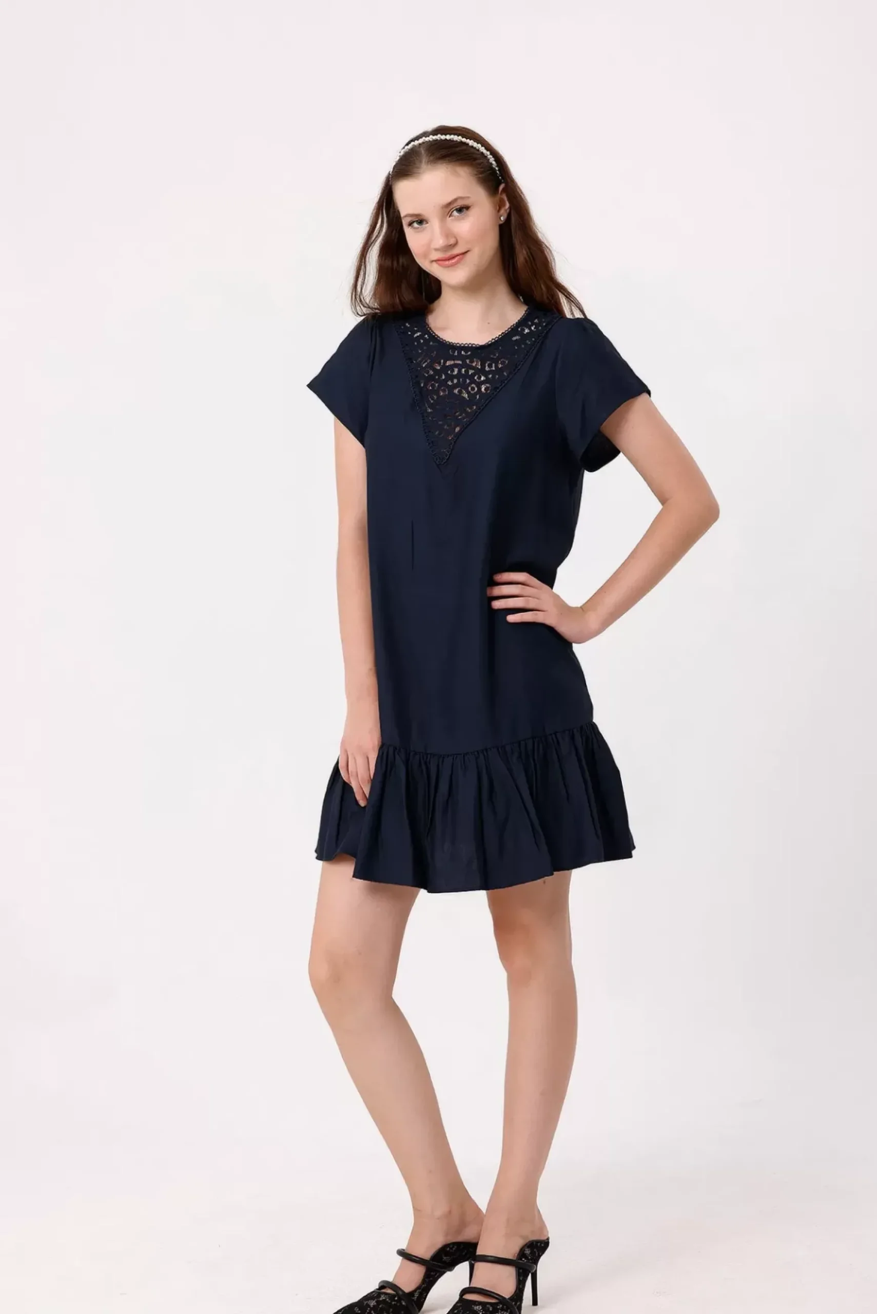 Découvrez cette robe élégante avec des manches courtes et un empiècement en V en dentelle à l’avant et au dos. Le bas de la robe est agrémenté d’un volant, tandis qu’un galon à l’encolure col rond ajoute une touche raffinée. Le dos boutonné en forme de goutte d’eau complète ce look sophistiqué.