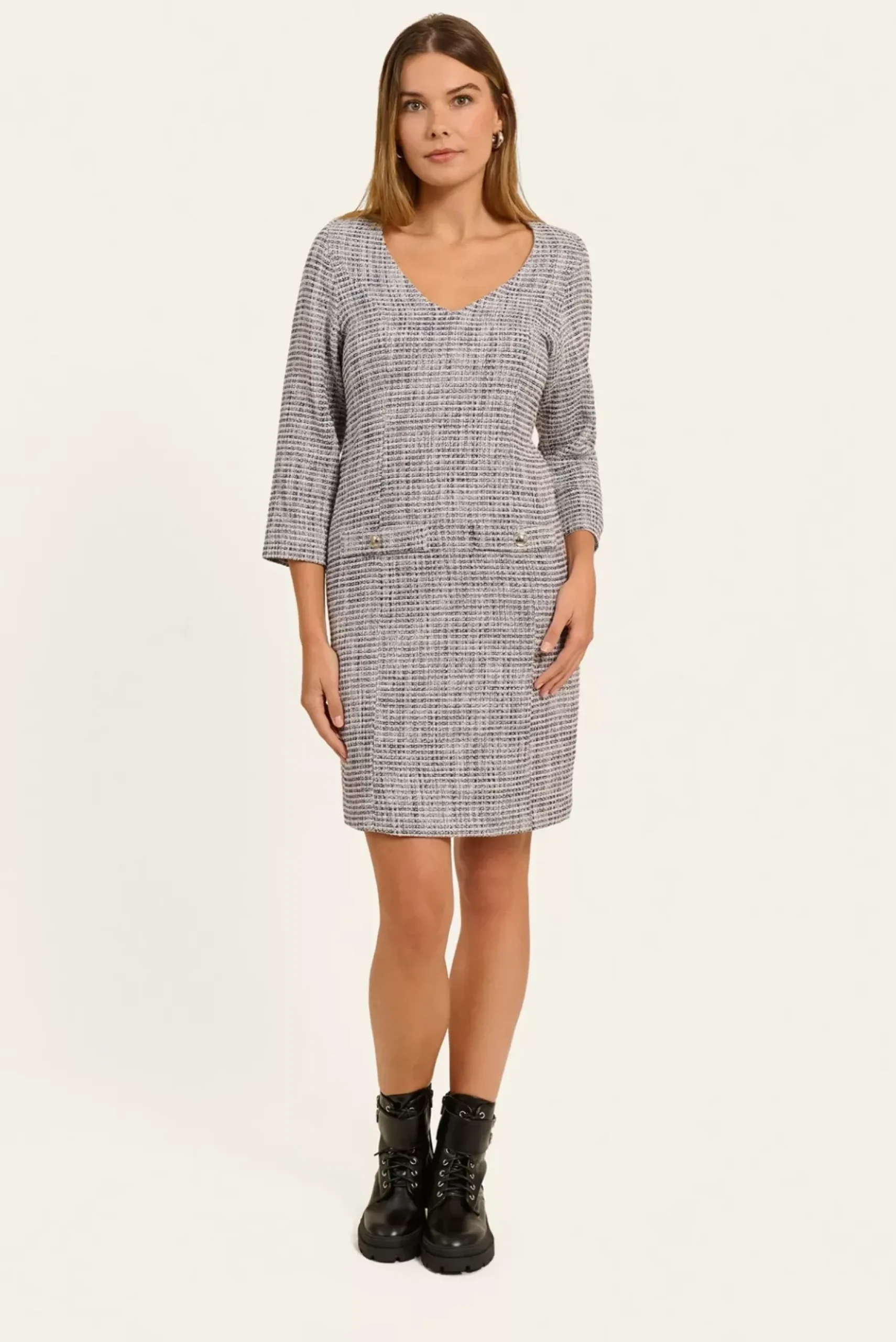 Cette robe courte à col V, doublée, offre une silhouette flatteuse grâce à sa découpe princesse et à ses manches 3/4 élégantes.
