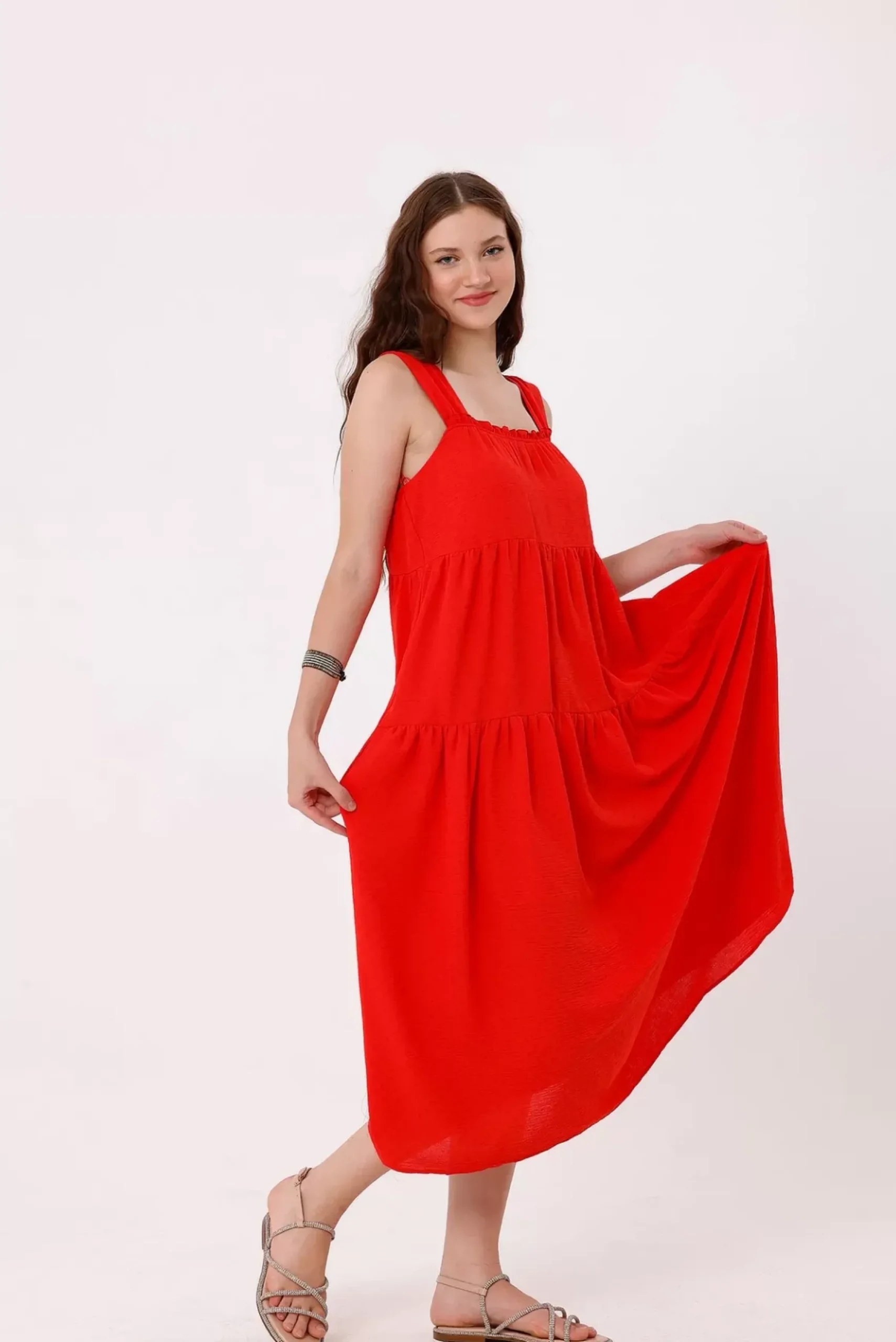 Optez pour une élégance sans effort avec cette robe longue et fluide : dotée de bretelles larges et de plusieurs découpes créant du volume. Elle est entièrement doublée et comporte un élastique à l’encolure pour un confort optimal.