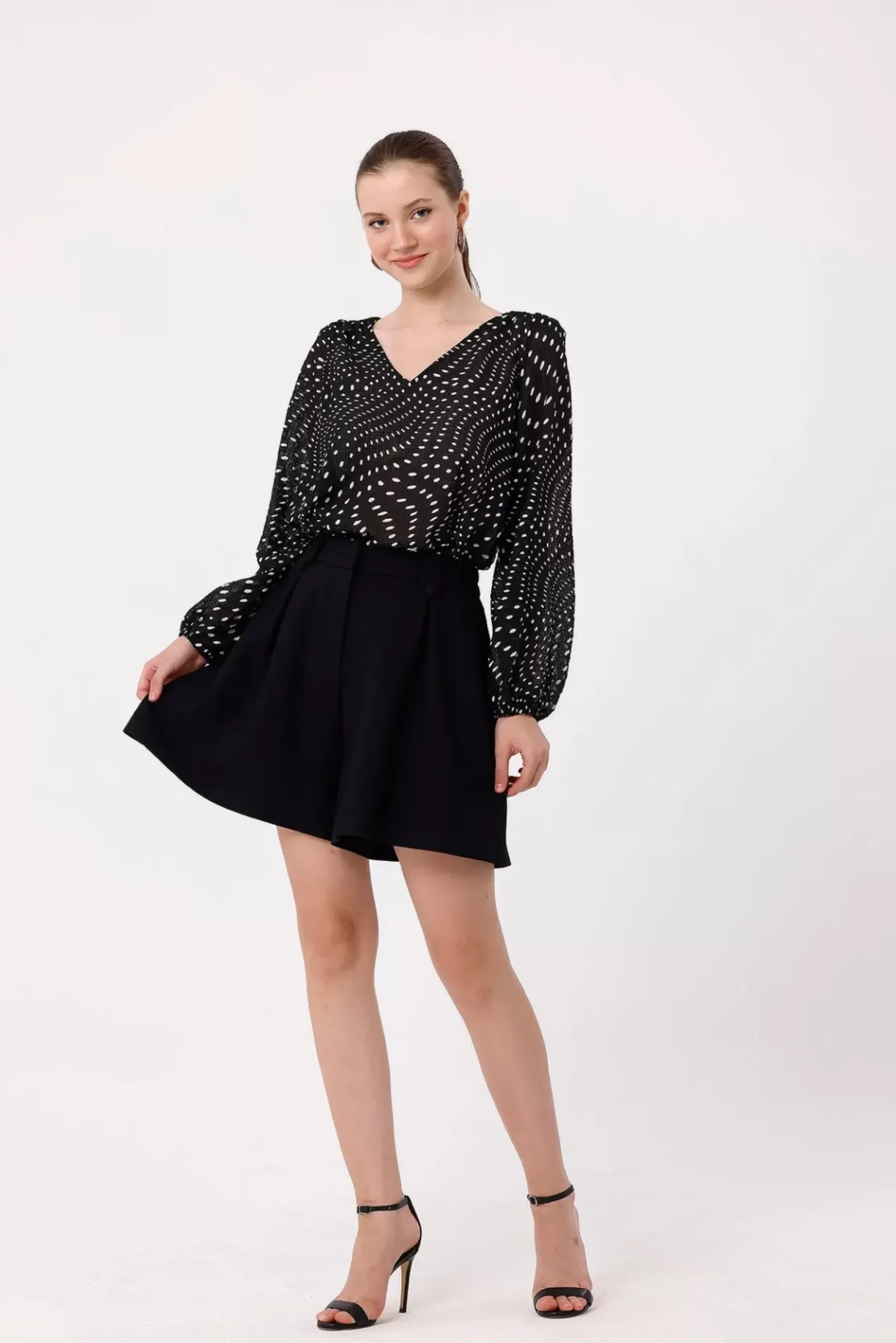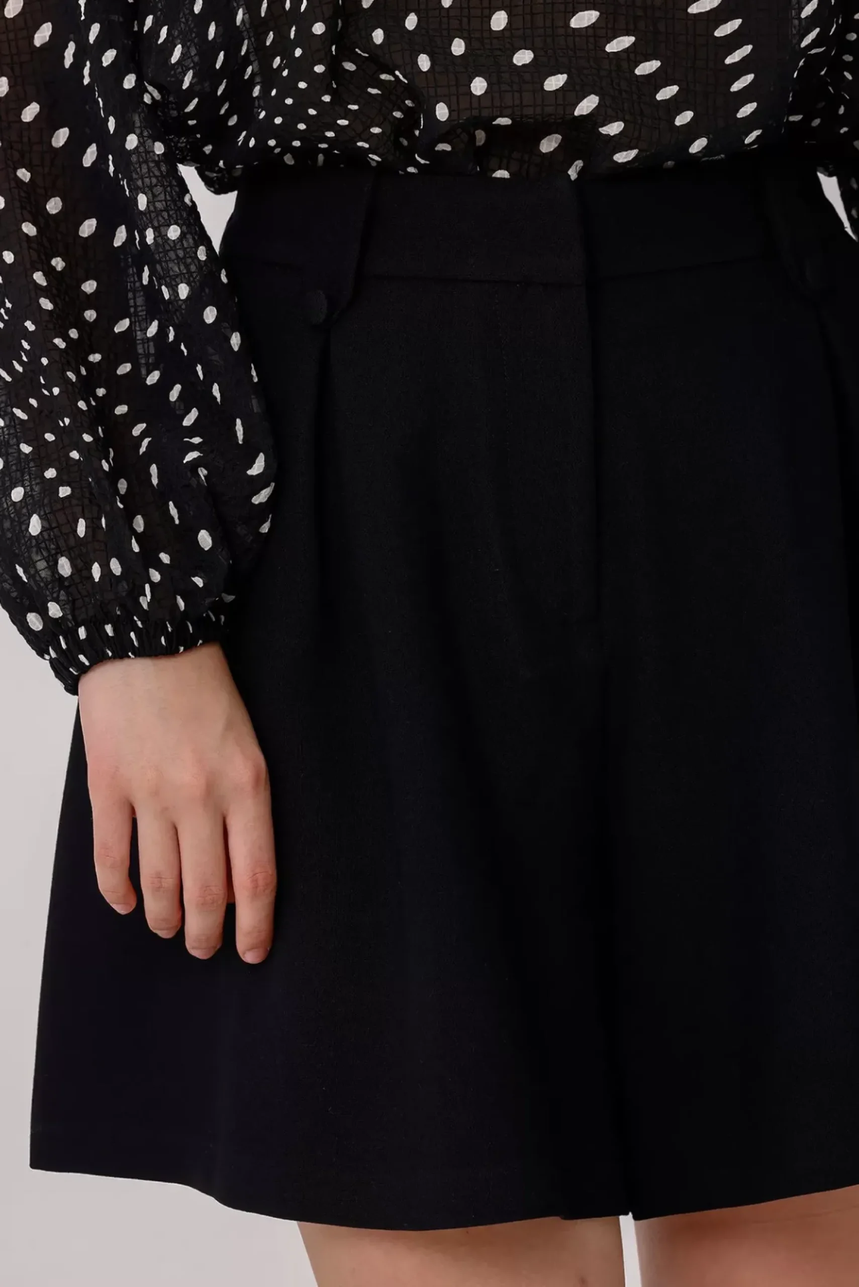 Découvrez ce short noir taille haute à pinces avec une taille élastiquée et deux passants de ceinture sur le devant. Parfait pour une allure élégante et confortable.
