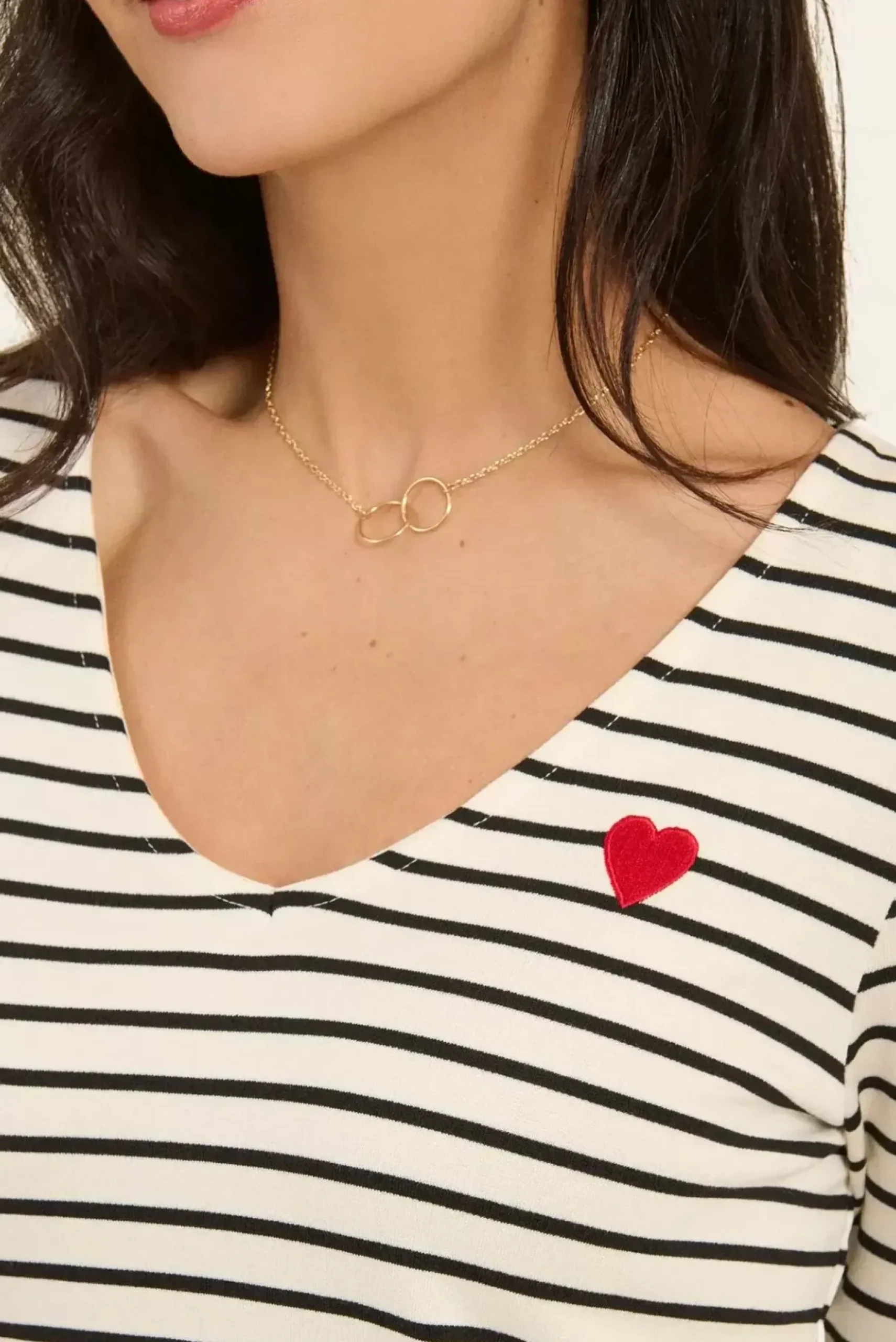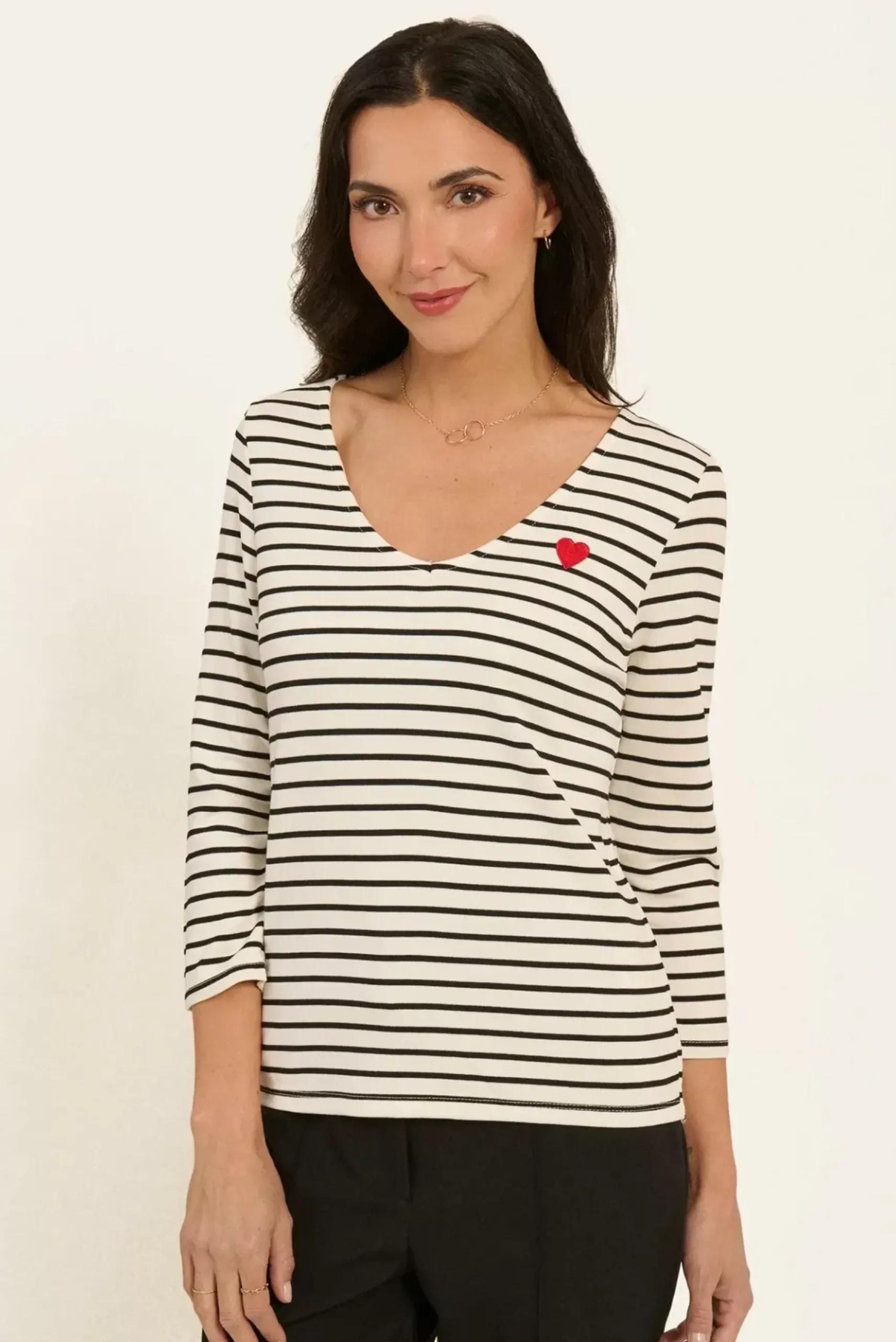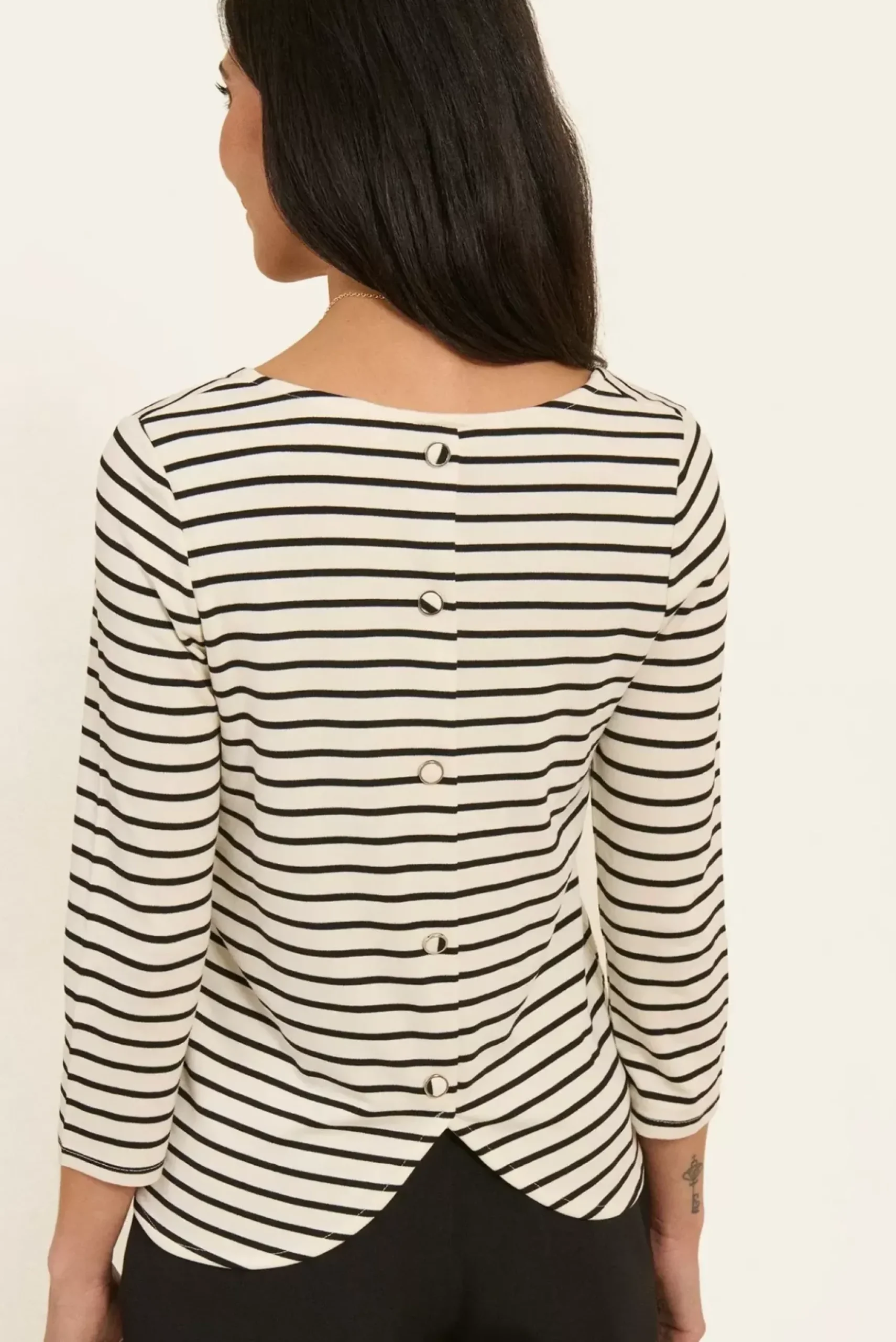 Ce t-shirt rayé à manches longues se distingue par un faux boutonnage original au dos, créant une élégante ouverture à la base.