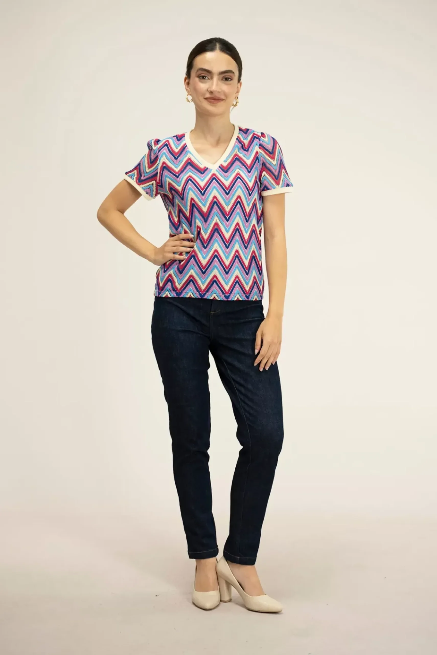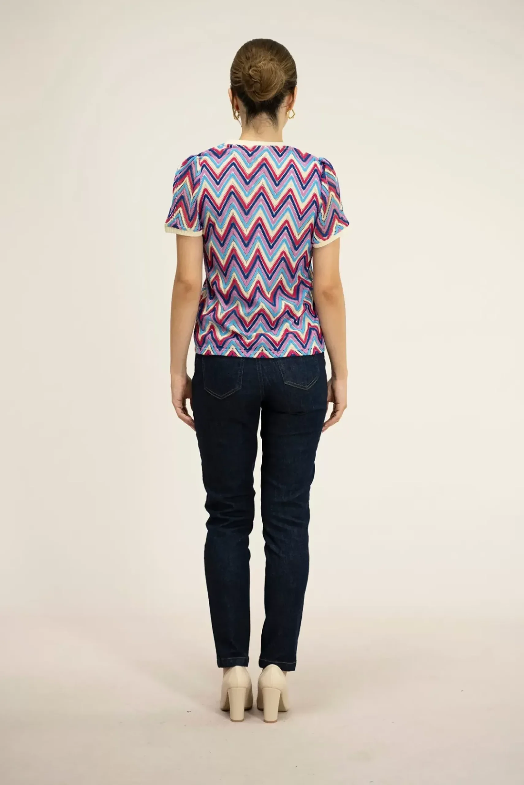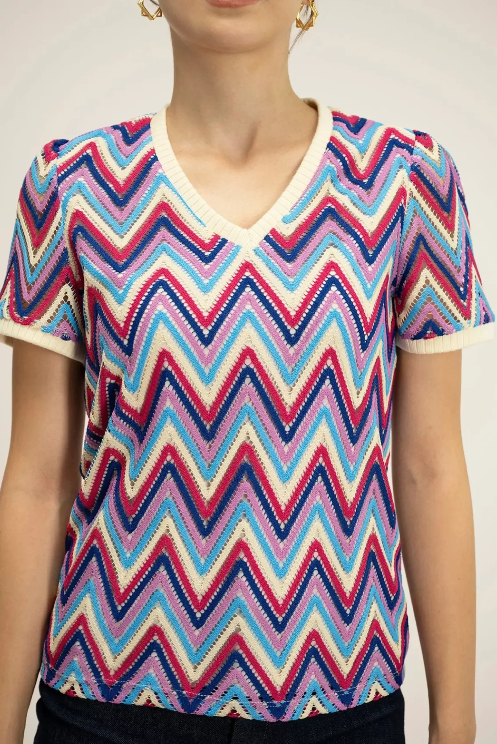 Découvrez ce top en macramé avec un effet Missoni : il présente une encolure en V flatteuse, des manches courtes et une finition en bord côte. Sa coupe droite et ajustée offre un style élégant et moderne.