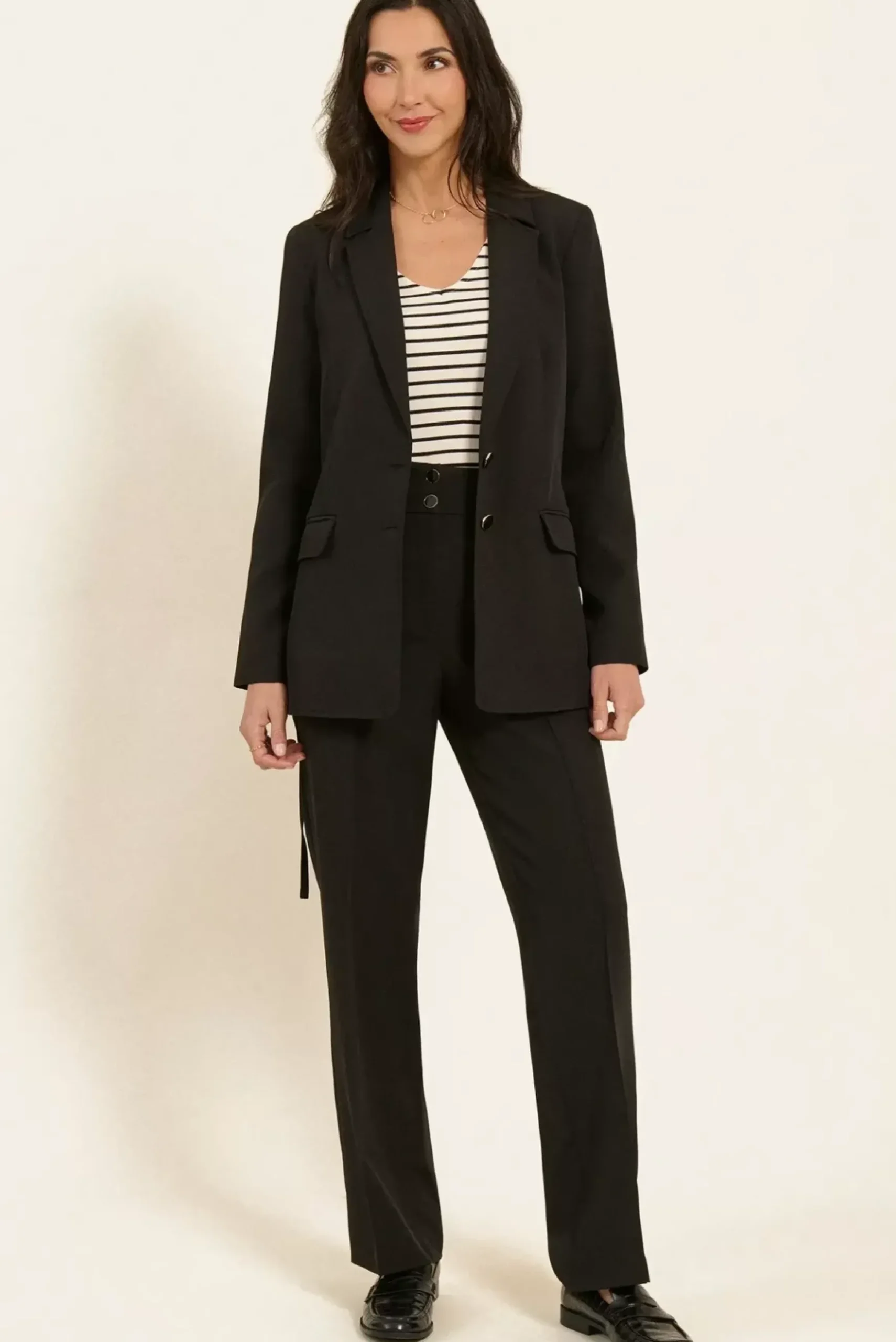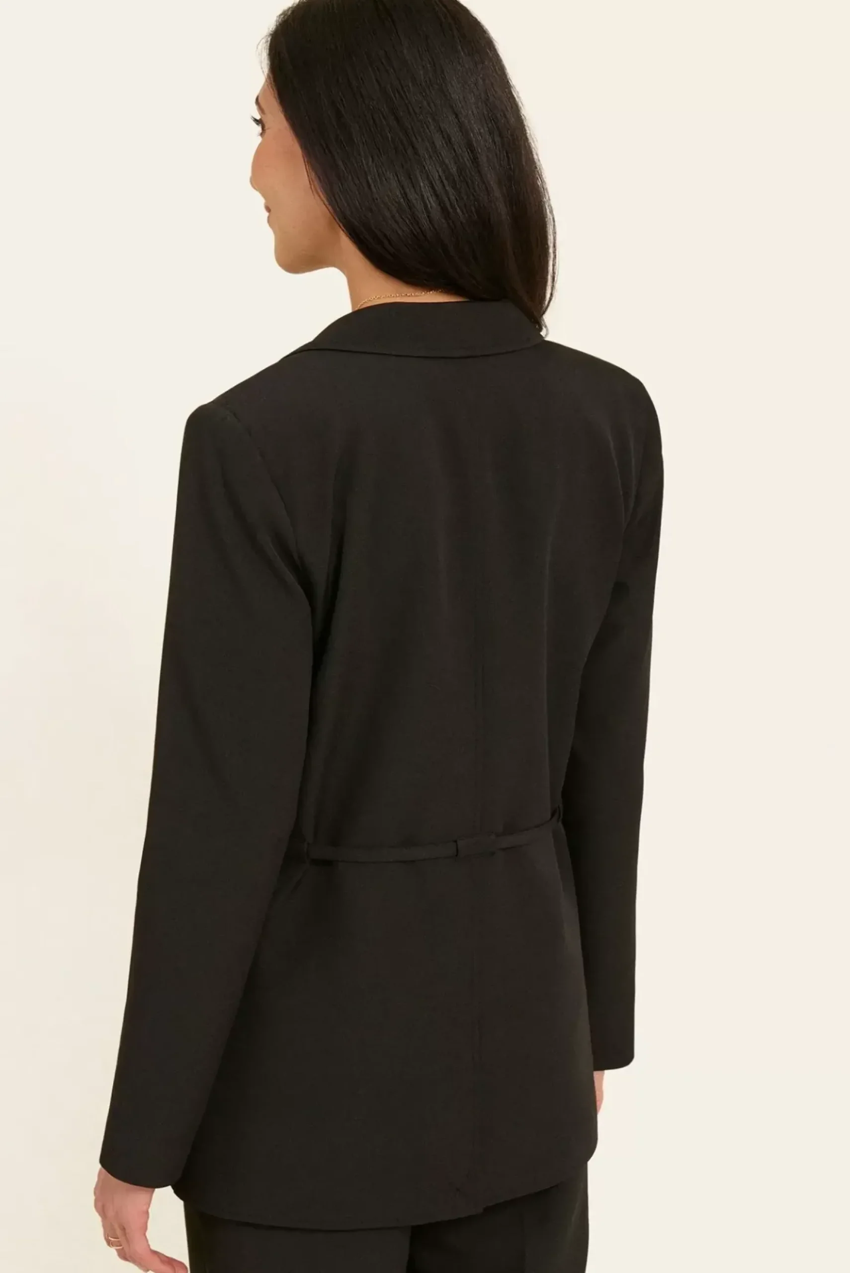 Ce blazer structuré, avec sa fine ceinture à nouer non amovible, apporte une élégance subtile. Doublé, il est doté de manches longues, de deux poches à rabat et d’une fente discrète au dos, pour une silhouette raffinée et ajustée.